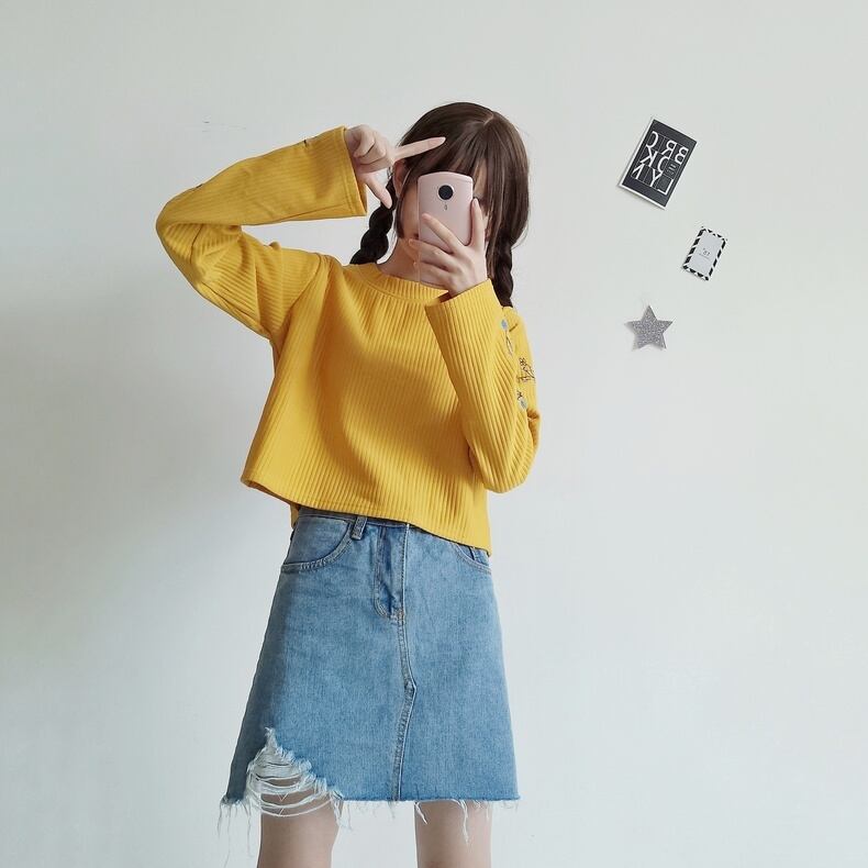 スプリング秋物ルーズプルオーバー ショートセーター Tシャツゆったりトップス ロング レッド 刺繍 春物 オータム 長袖 コーデ Marchs29176536443