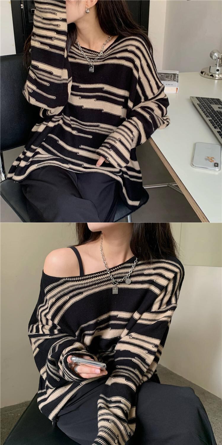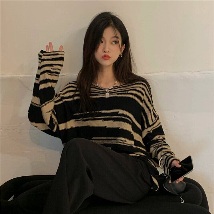 韓国ファッションルーズスタンダードストライプニットセーター スプリング秋物薄手トップス ゆったりシャツ レトロ 春物 オータム スタイル コーデ Marchs13514969113