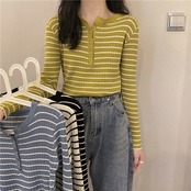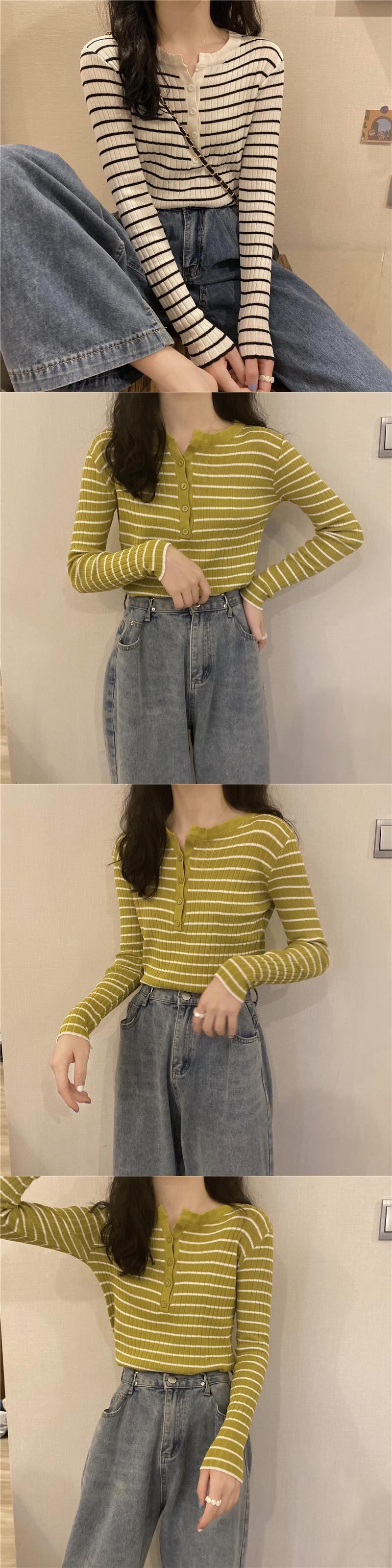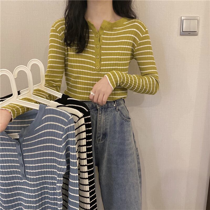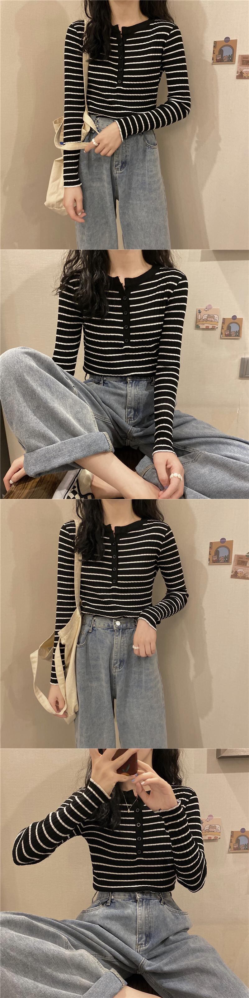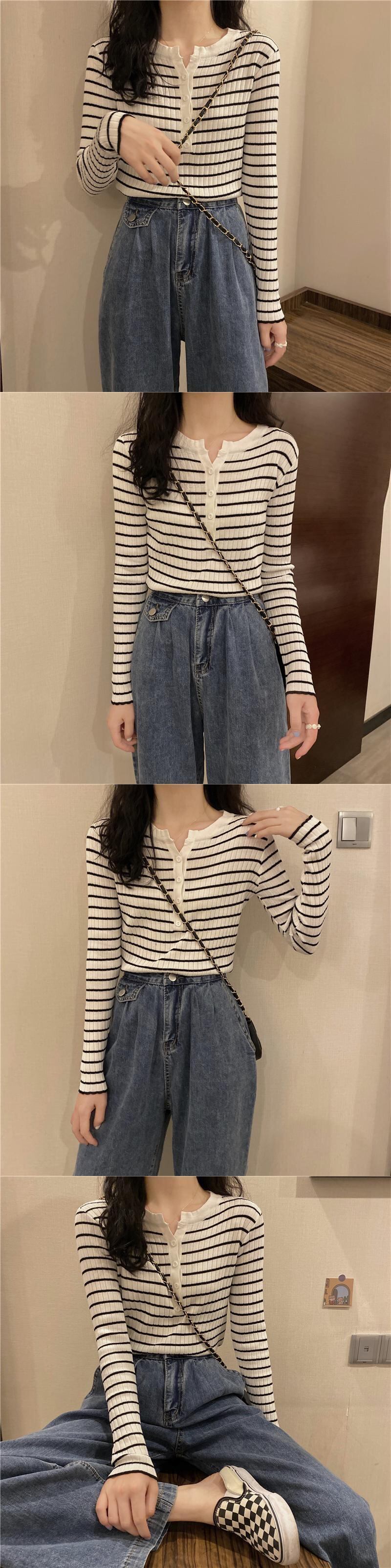 ブラックホワイトストライプニットセーター スプリングスリムゆったりシャツ トップス ロング 春物 長袖 コーデ Marchs54214091705