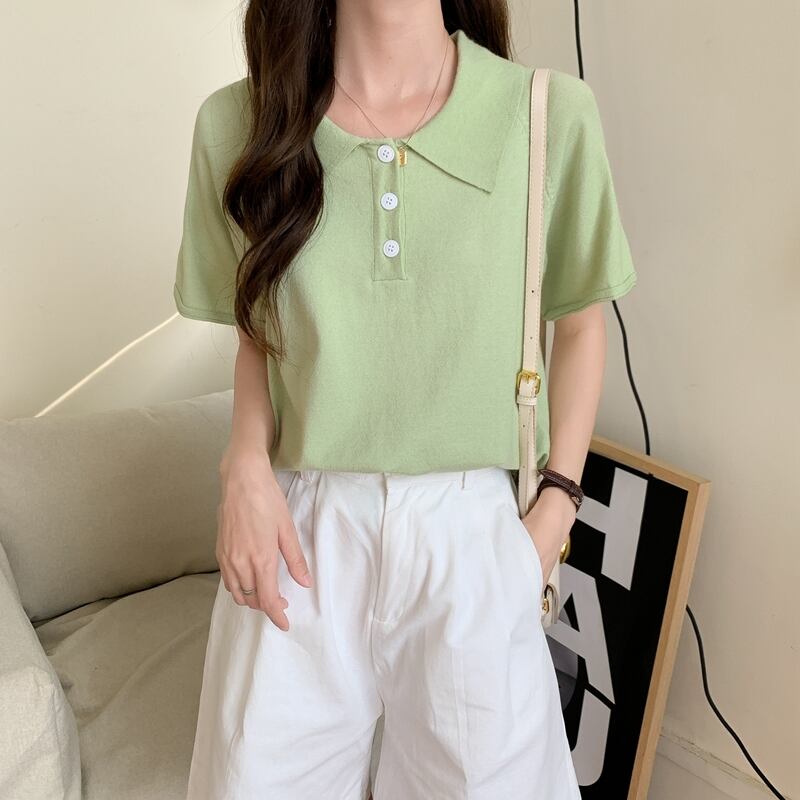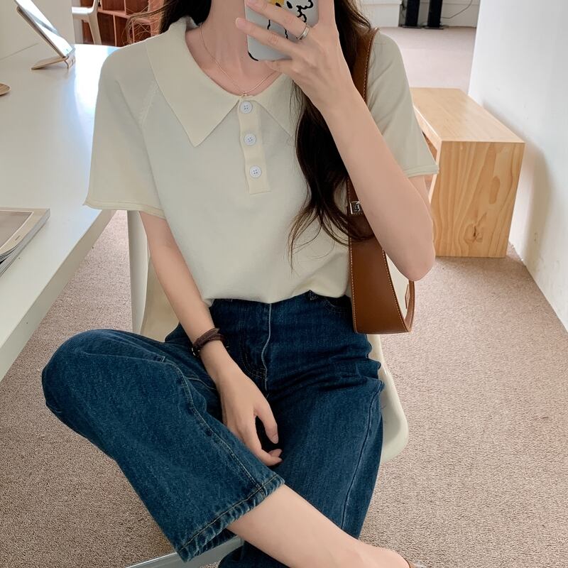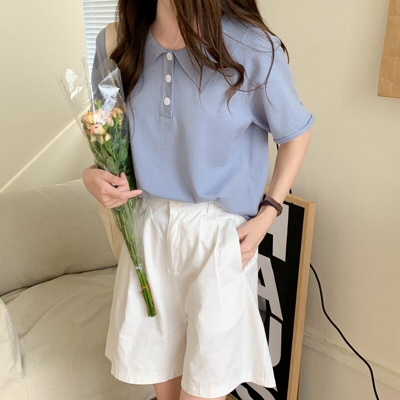 スタンダードニットシャツ ブルーTシャツ夏服薄手ルーズトップス レトロ 夏物 コーデ Marchs31154690102