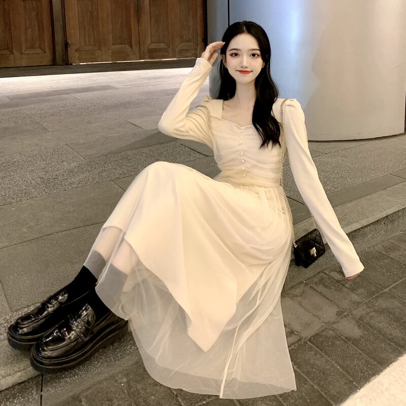 ロングメッシュワンピーススプリング秋物スタンダードブラックカラースカート レトロ 春物 オータム スクウェア 長袖 コーデ marchs6735712745748