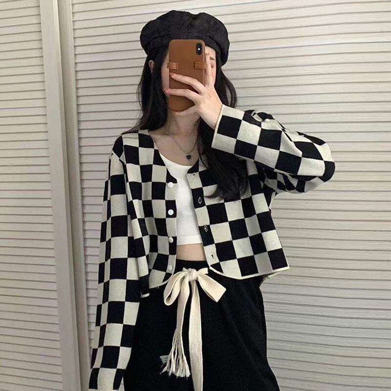 色:チェック柄カーディガン,黒いズボン