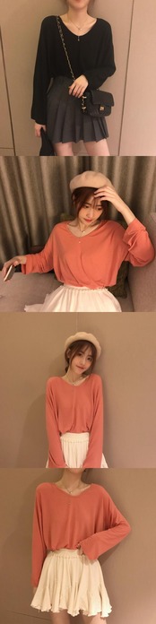 秋物ソリッド カラー薄手VネックTシャツシャツ ルーズ韓国ファッションゆったり ロング オータム ソリッドカラー スタイル 長袖 コーデ Marchs33433925625