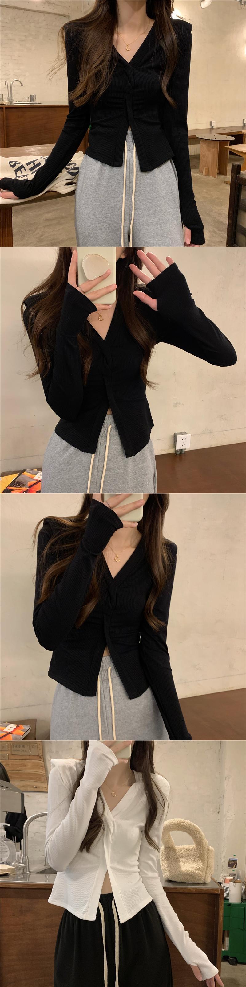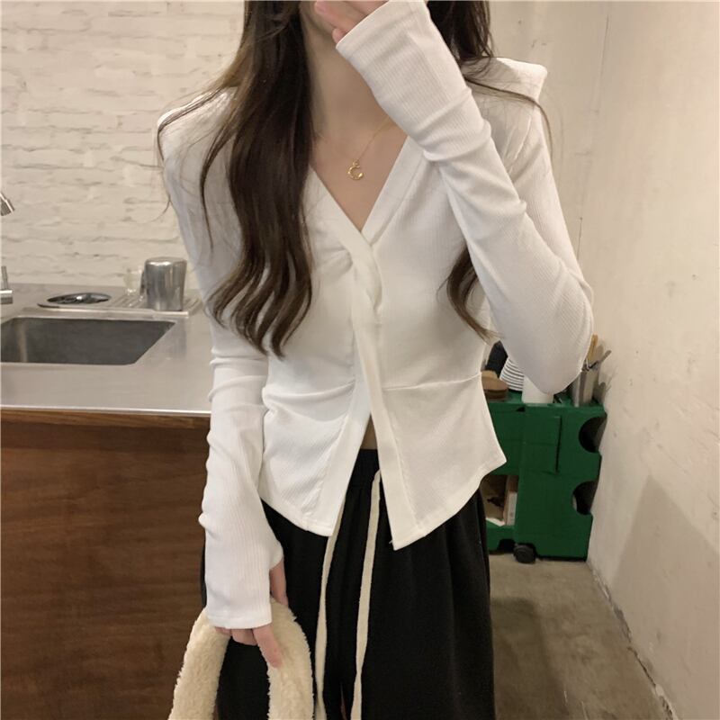 スプリングスリムVネックスリットホワイトTシャツシャツ ショートトップス ゆったり ロング 春物 ピュア 長袖 コーデ Marchs80193669064