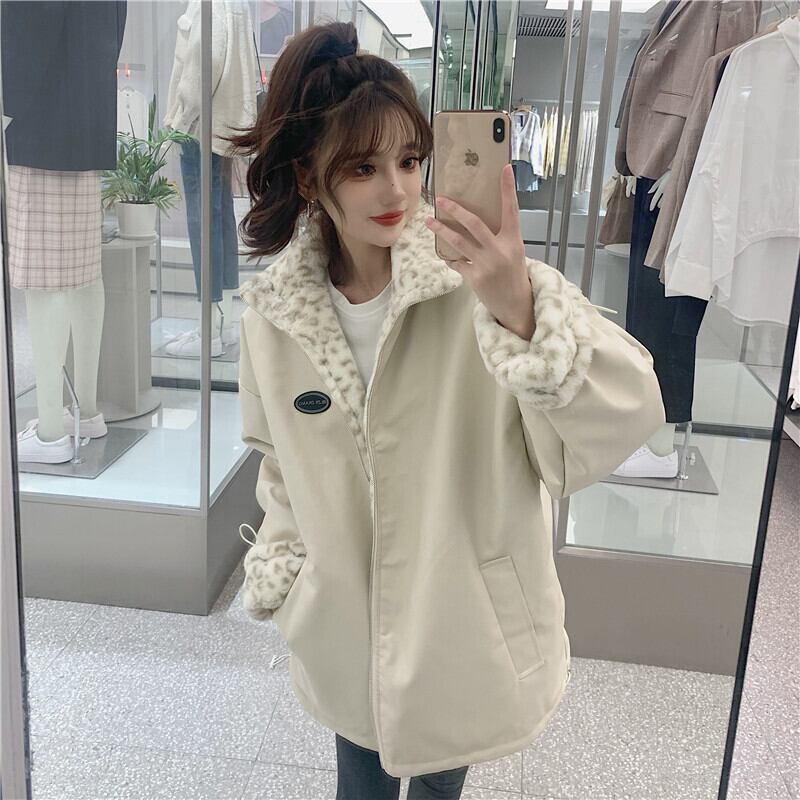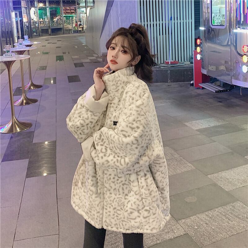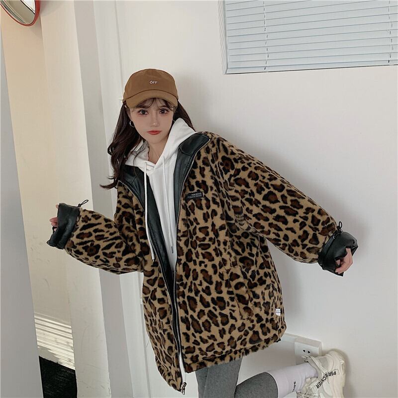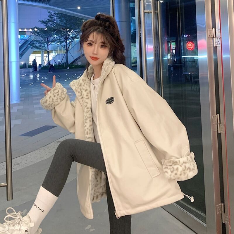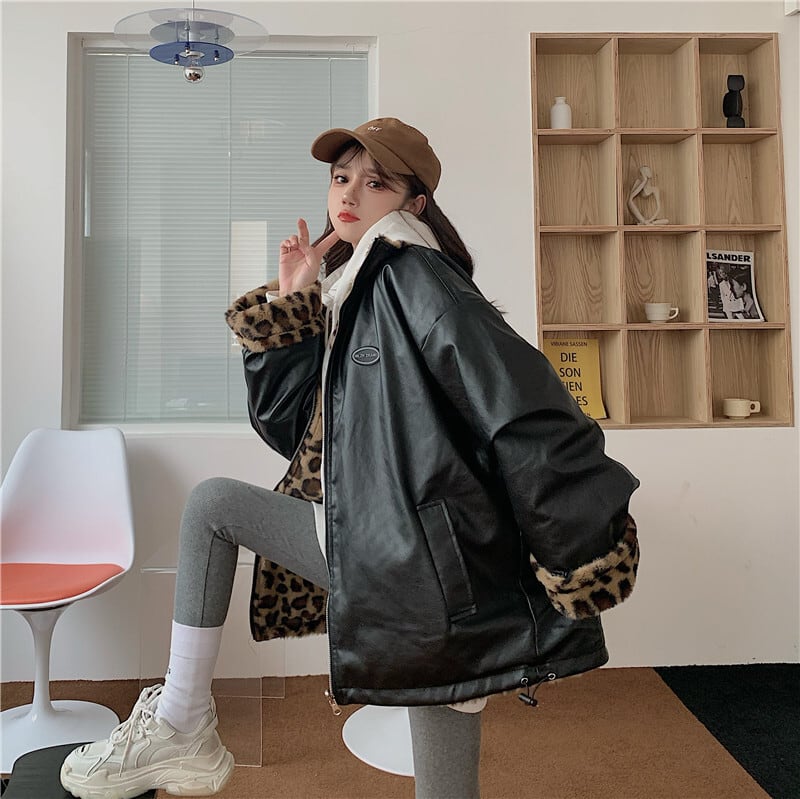 レオパードプリント柄レザージャケット ウィンター厚みルーズカラー 冬物 ミドル丈 コーデ Marchs90854897333