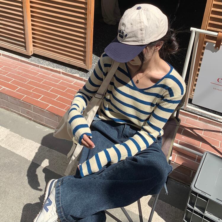 Vネックストライプニットセーター スタイル夏服ゆったりシャツ トップス ロング 夏物 長袖 コーデ Marchs58586314911
