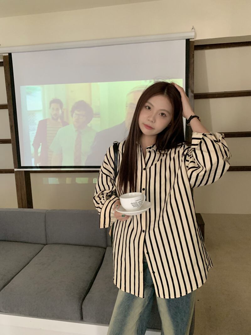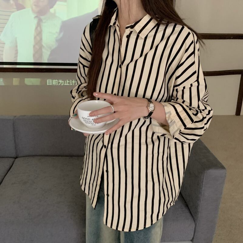韓国ファッションスタイルストライプシャツ スプリングスタンダードルーズ薄手トップス レトロ 春物 ミドル丈 コーデ Marchs50782491270