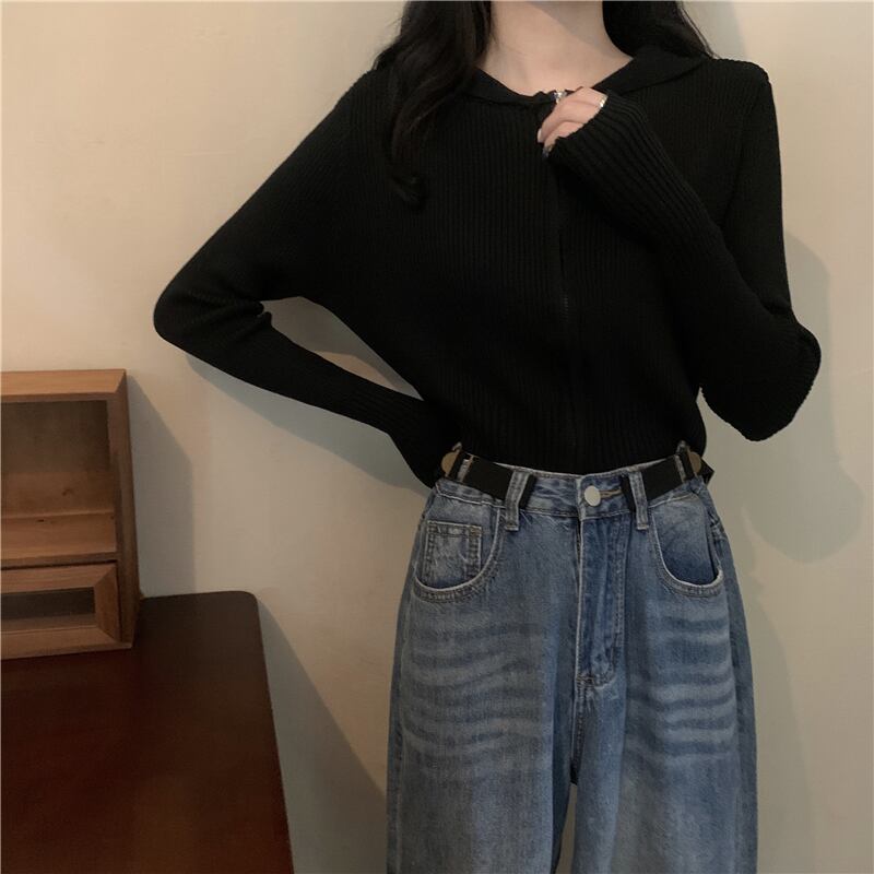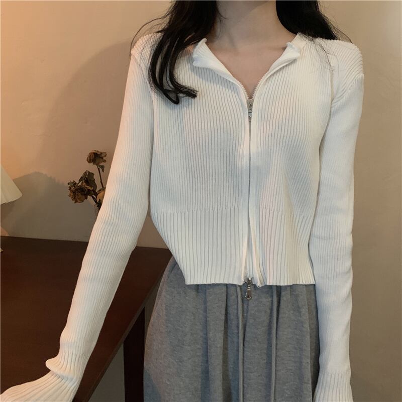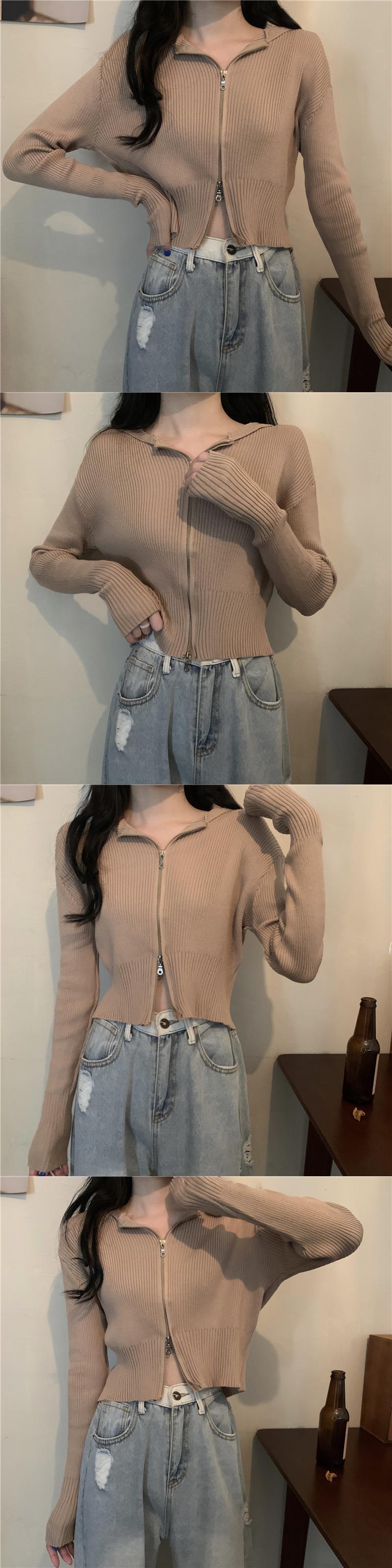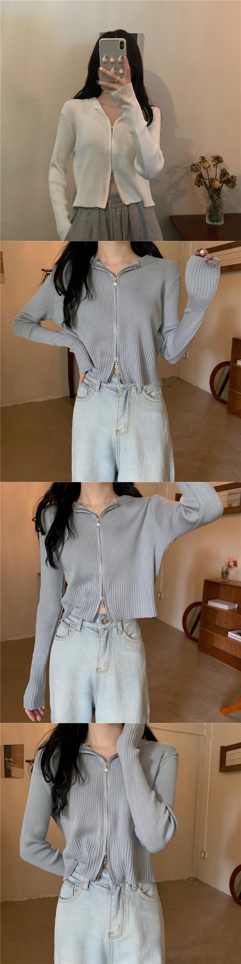 スタンダードフードストライプニットカーディガン夏服ダブルジッパーショートトップス NEW レトロ 夏物 コーデ Marchs74657944513