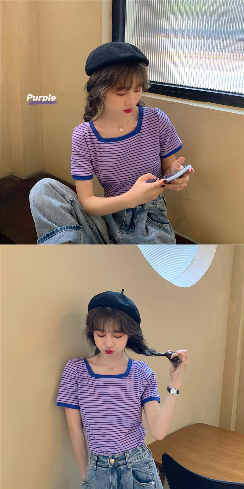 レッドストライプTシャツ夏服スタンダードスタイル薄手トップス レトロ 夏物 スクウェア コーデ Marchs83037533640