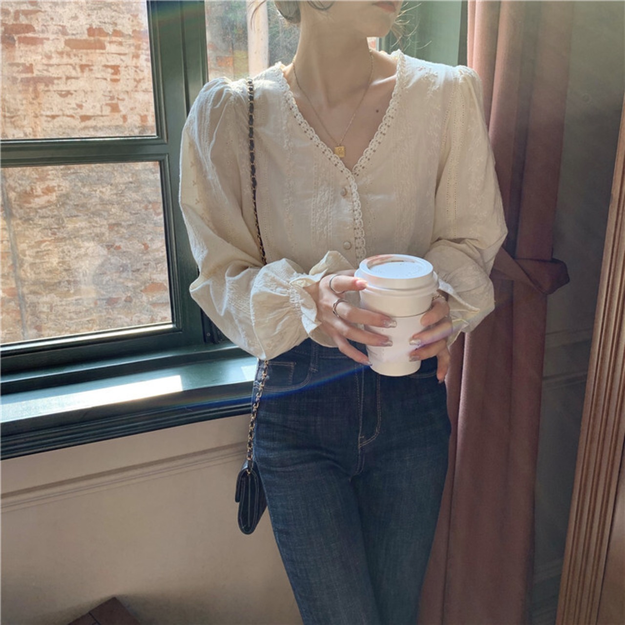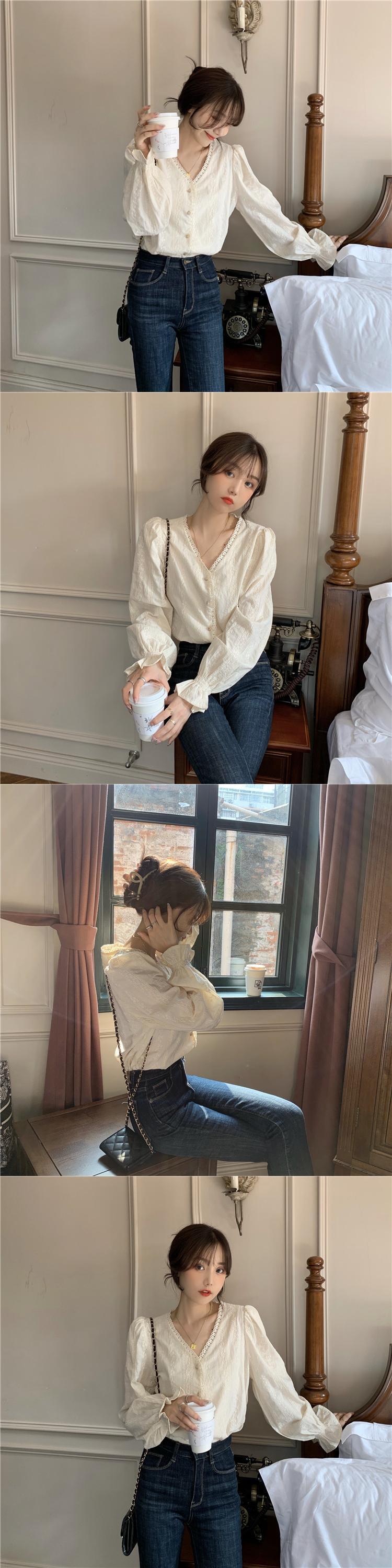 Vネックスリーブトップス スプリング秋物シャツ レース 春物 オータム ステッチ コーデ Marchs51946028134