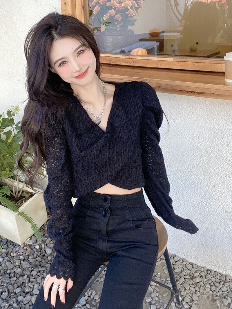 レースゆったりシャツ スプリングショートトップス 春物 ピュア パフスリーブ コーデ Marchs18997457892