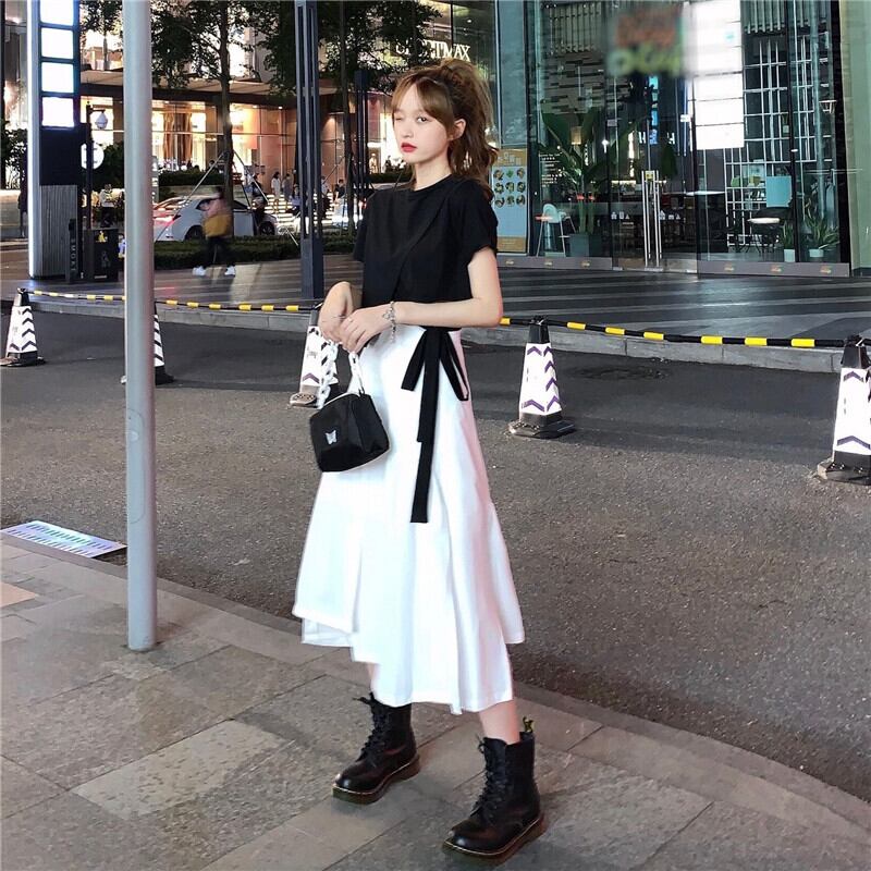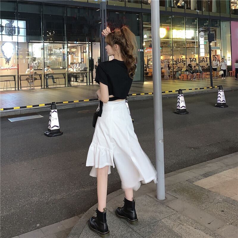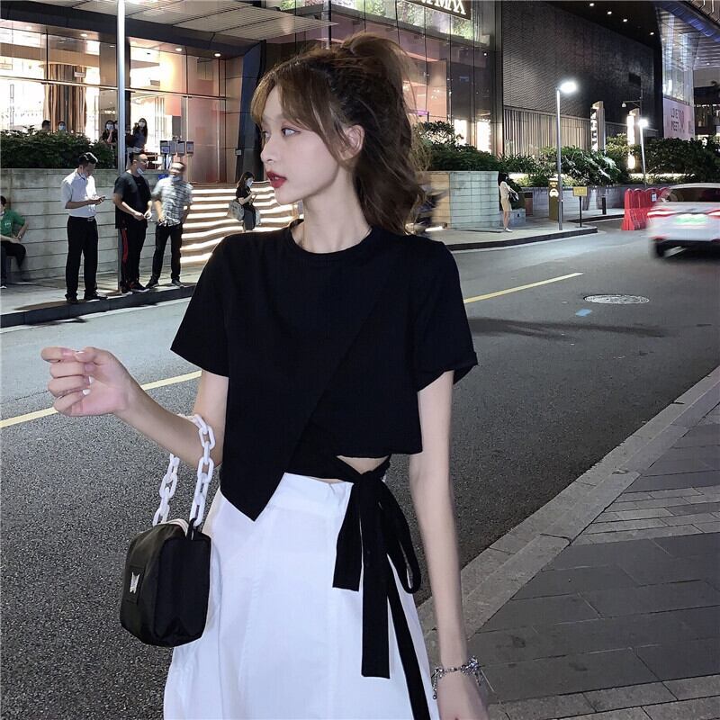 ショートトップス 夏服ルーズ薄手ストラップ ブラックハイウェストウェスト半袖スリーブTシャツ ハーフスリーブ 夏物 ウエスト コーデ Marchs9900298921