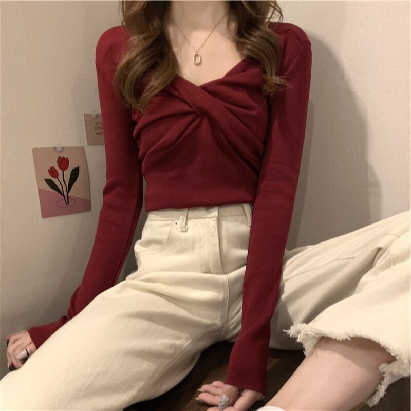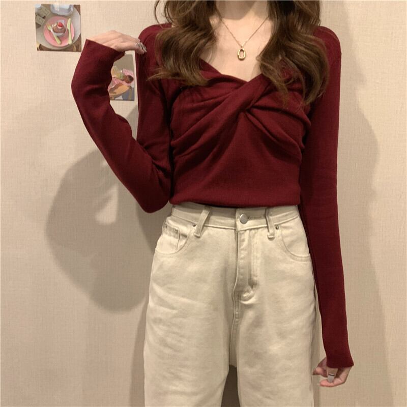 レッドニットゆったりシャツ スタイルクロストップス コーデ Marchs46404489659
