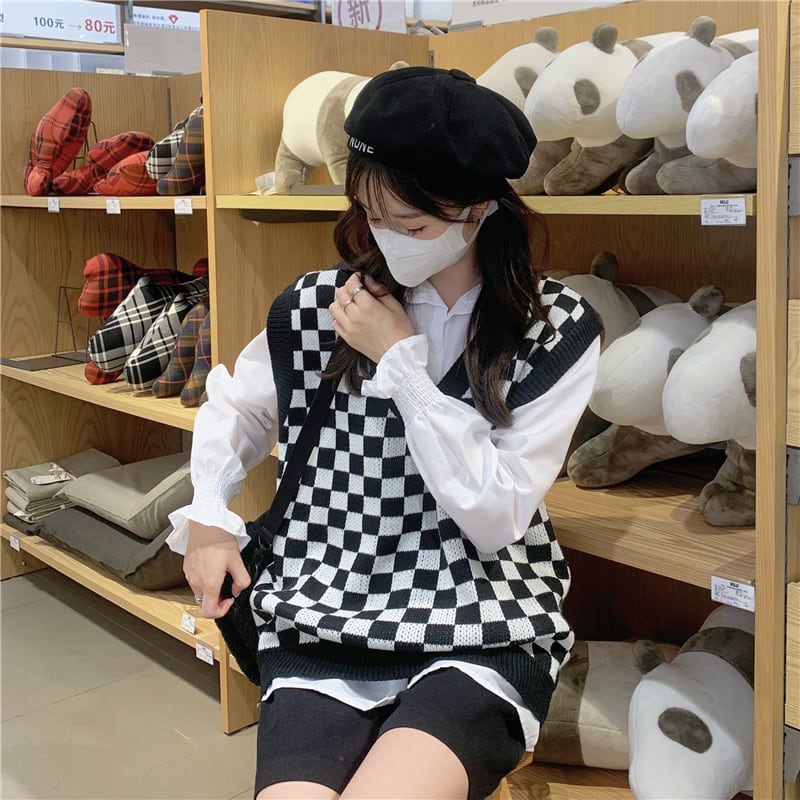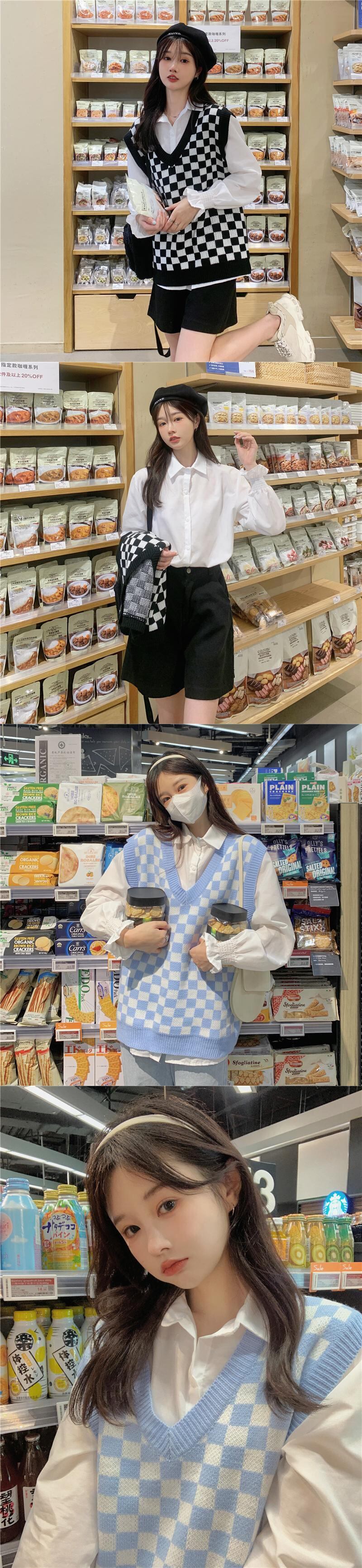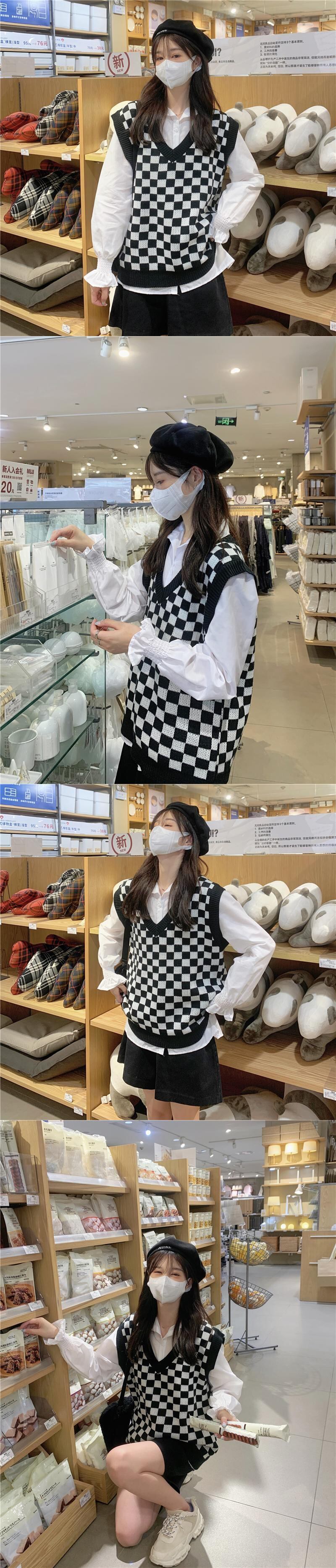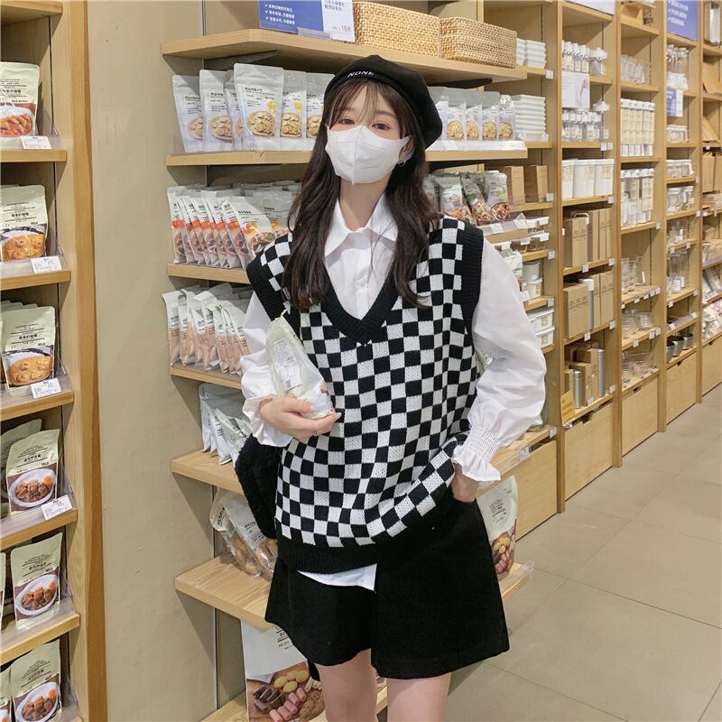 色:白いシャツのワンピース,黒と白のベスト,ブルーチェックベスト