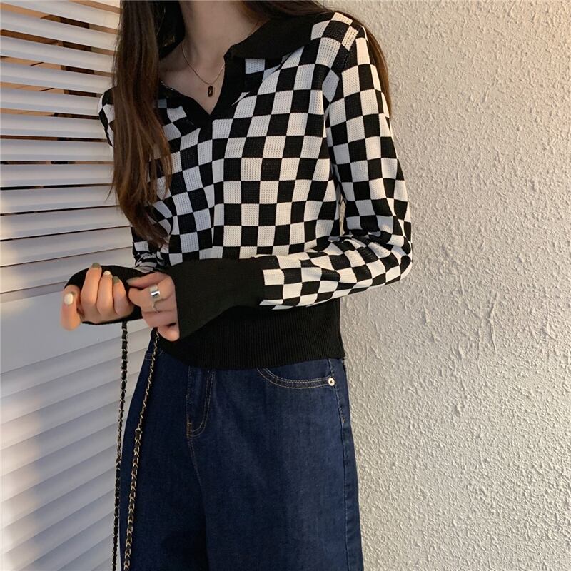 格子柄カラーTシャツシャツ ニットゆったり夏服ハイウェストショートトップス ロング 夏物 長袖 ウエスト コーデ Marchs46292447648