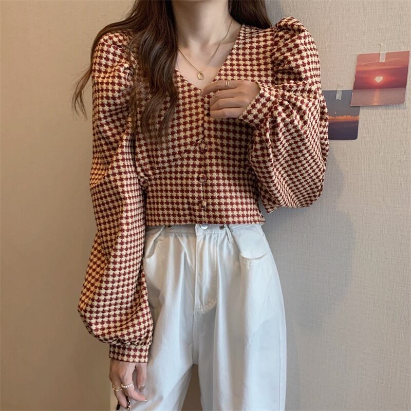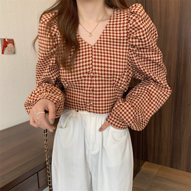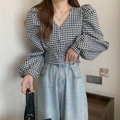 スプリングスリーブ格子柄シャツ Vネックショートトップス 春物 コーデ Marchs62888973877