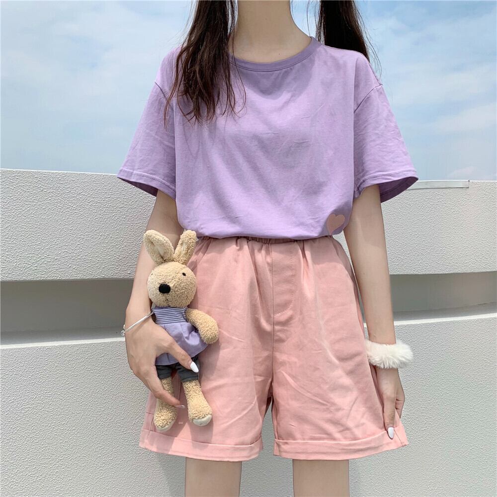 色:パープルTシャツ,白いTシャツ,緑のTシャツ,ピンクのTシャツ,ピンクのショートパンツ,黒のショートパンツ,ホワイトショーツ,パープルショーツ