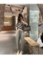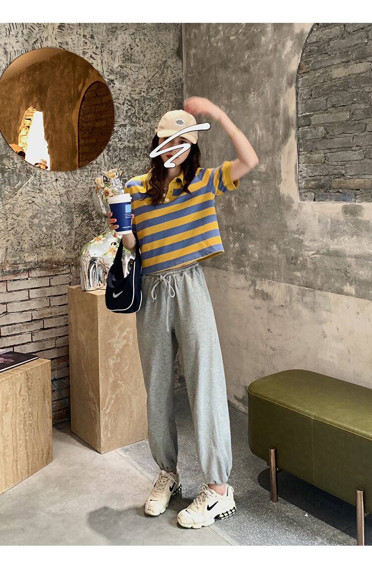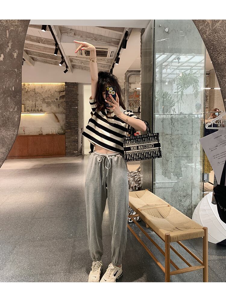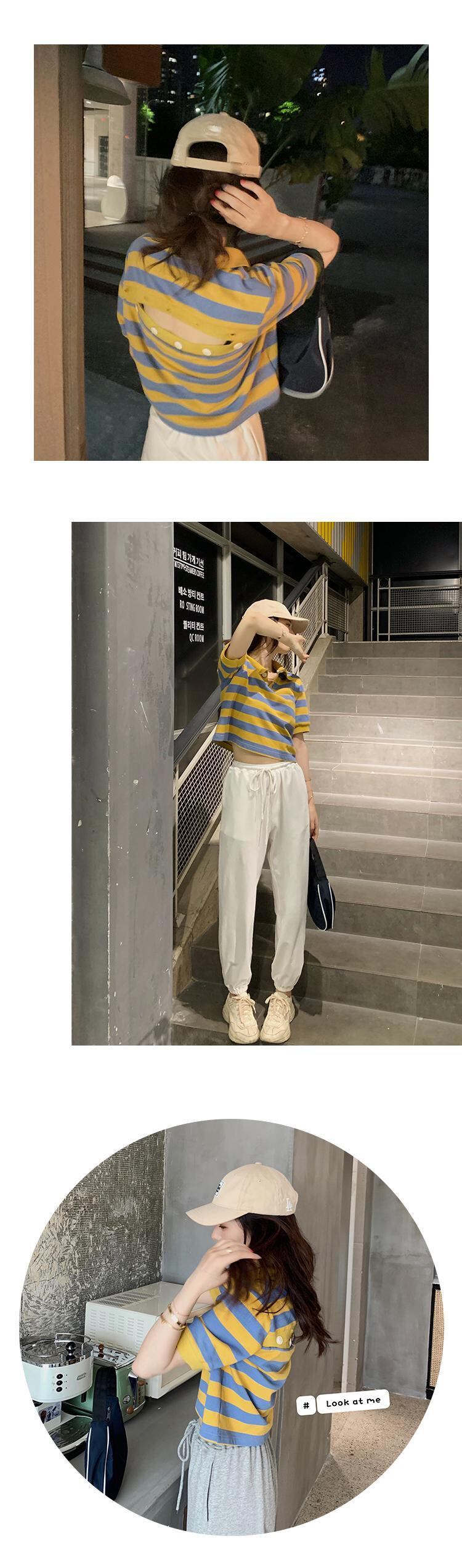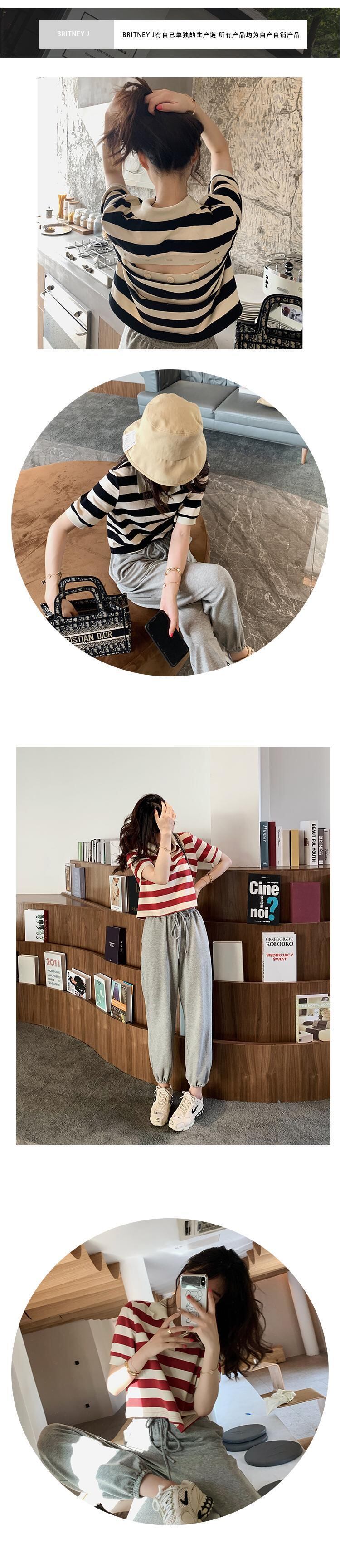 ブラックホワイトストライプTシャツ夏服カラーハイウェストウェストトップス コットン 夏物 ウエスト コーデ Marchs48378139787