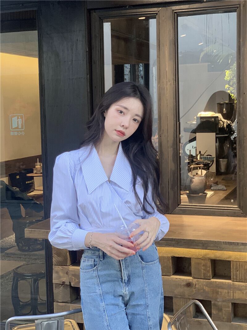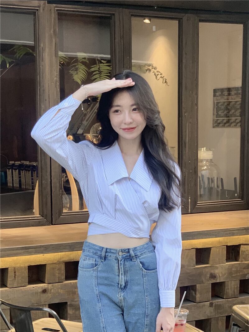 ストライプシャツ スプリングショートトップス ロング 大人ガーリー スウィート キュート カジュアル 春物 長袖 コーデ Marchs23186123341