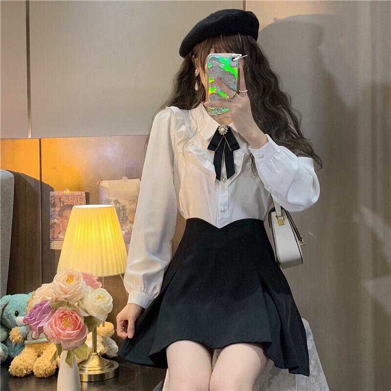 スプリング秋物ホワイトシャツ リボントップス ロング 春物 オータム 長袖 コーデ Marchs88179426698