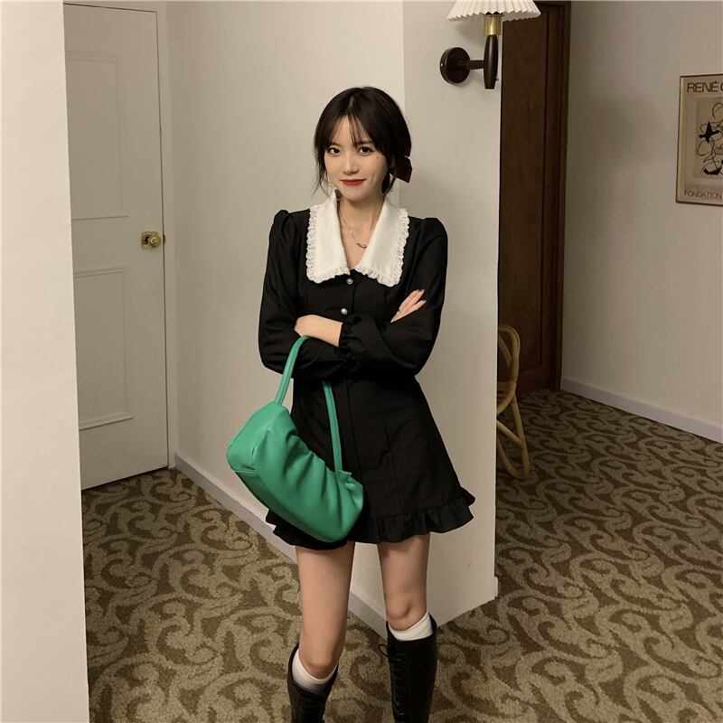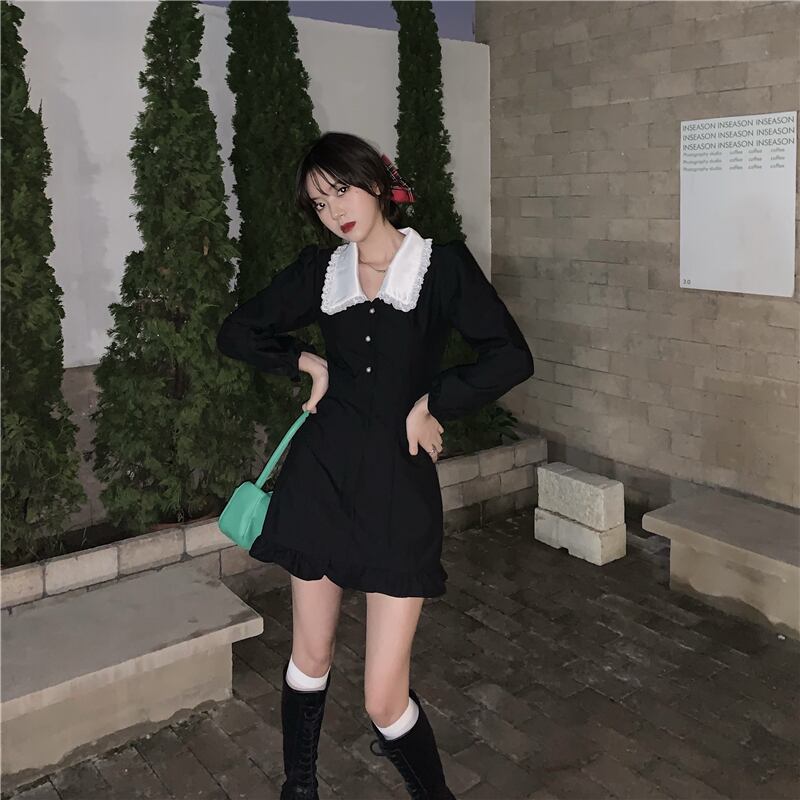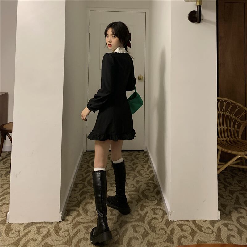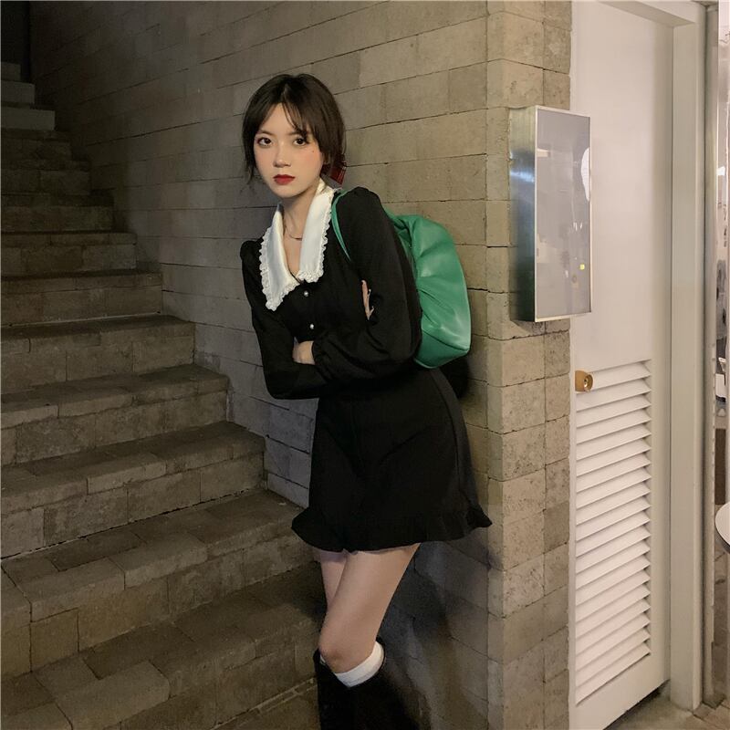 スタンダードカラーショートスカート レディーススプリングウェストブラックワンピース ロング レトロ 春物 長袖 ウエスト コーデ Marchs30982998835