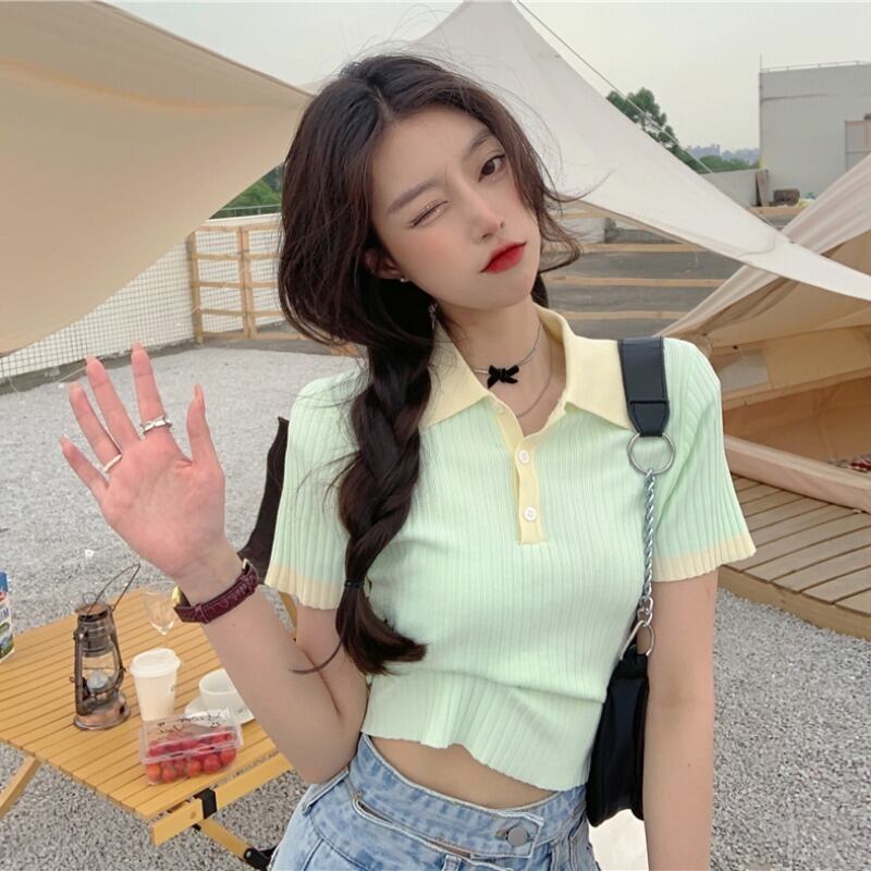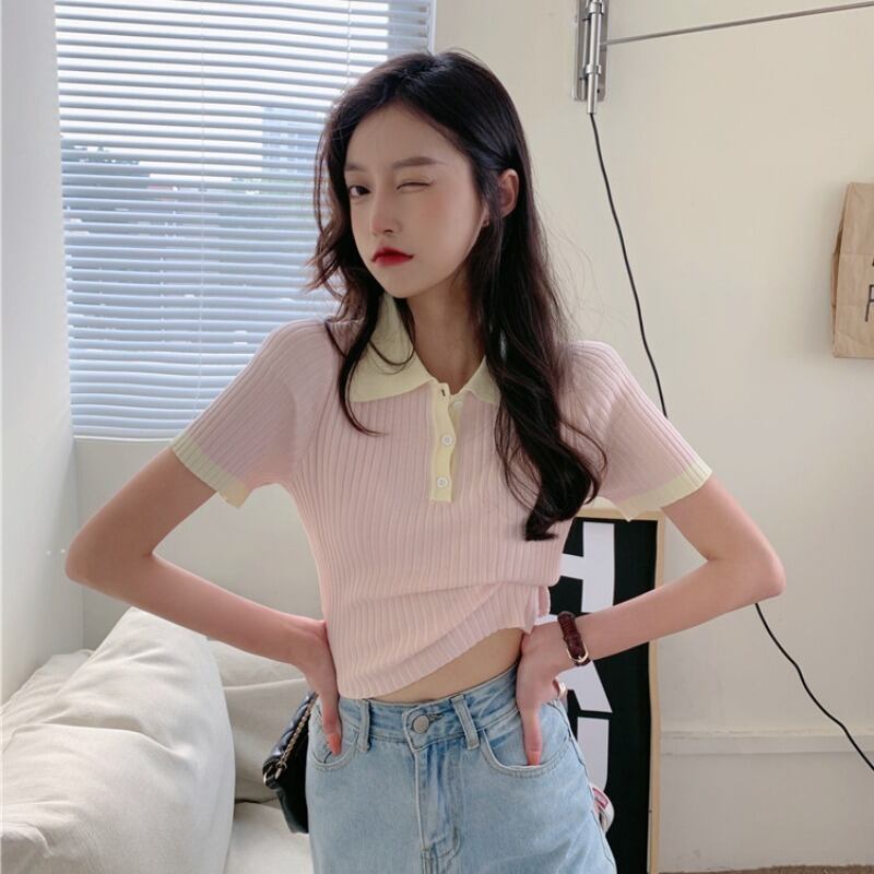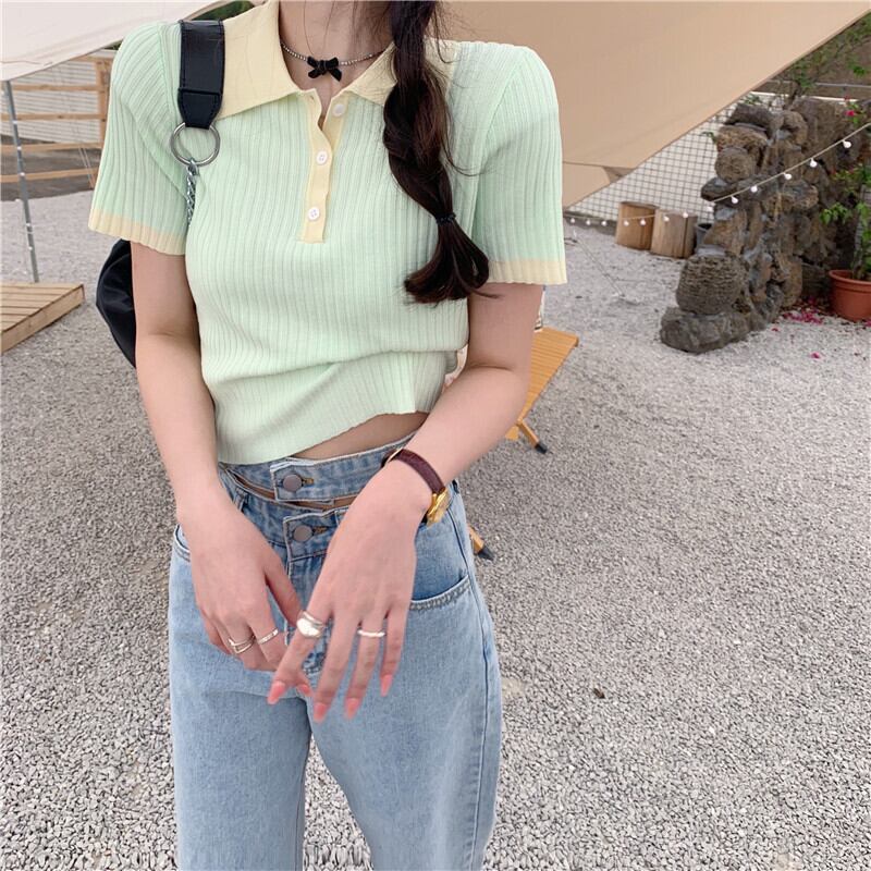 ストライプカラーニットショート夏服Tシャツシャツ ゆったりトップス 夏物 コーデ Marchs85556949541