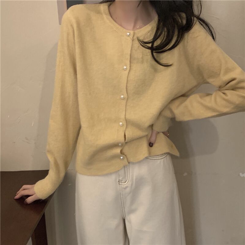 夏服スタイルラウンドネックパールボタンセーター ニットカーディガンコート レディースホワイト 夏物 Oネック 真珠 コーデ Marchs51445173311