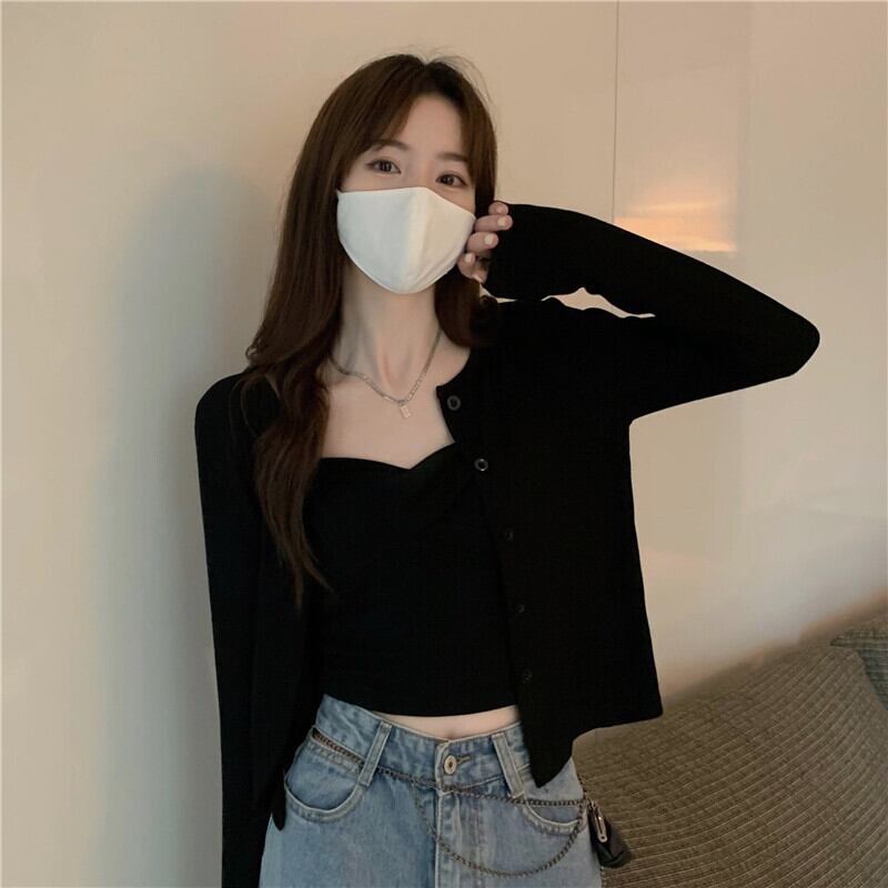 ブラックカーディガンセット スプリング秋物薄手ショートトップス ロング 春物 オータム 長袖 コーデ Marchs51989522350