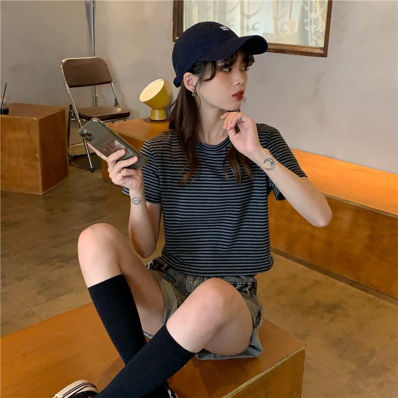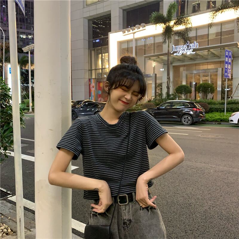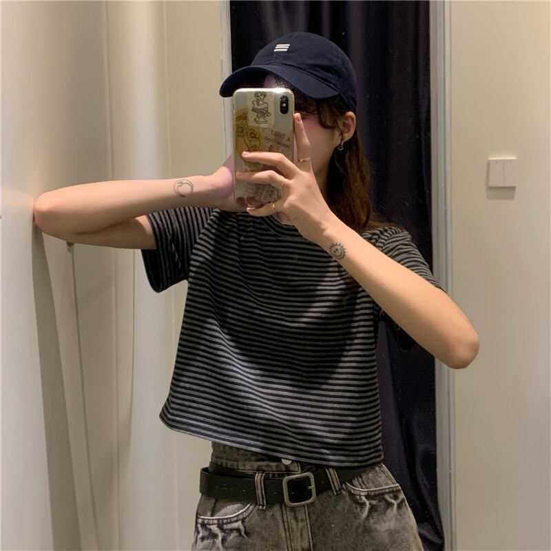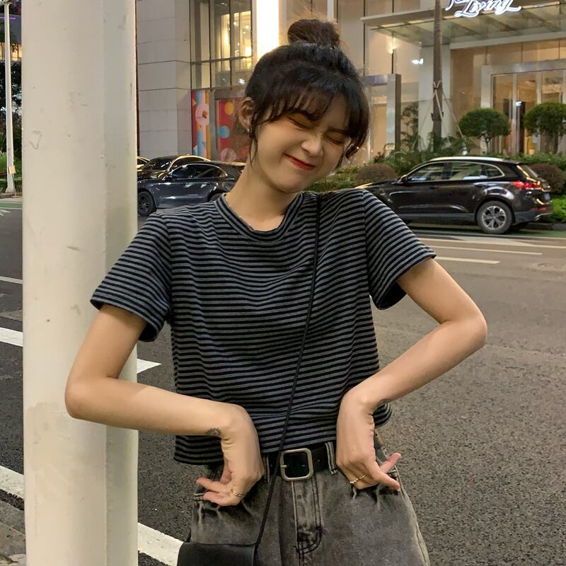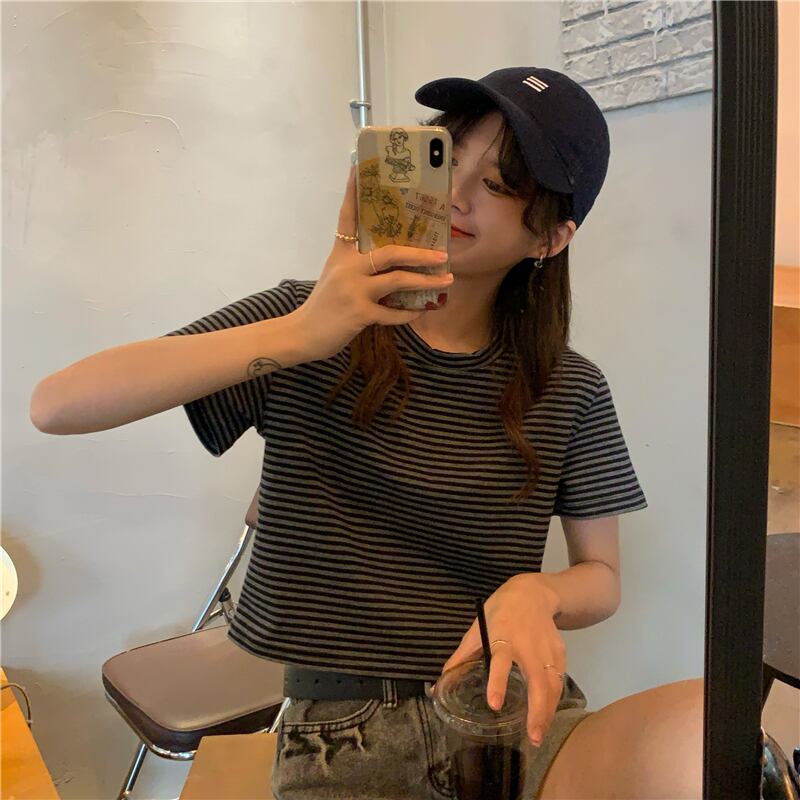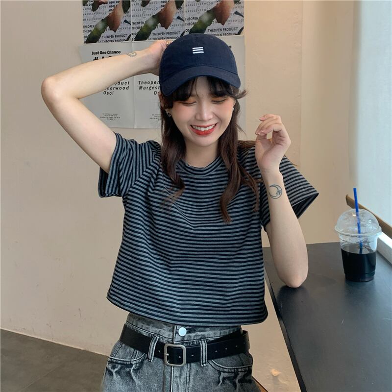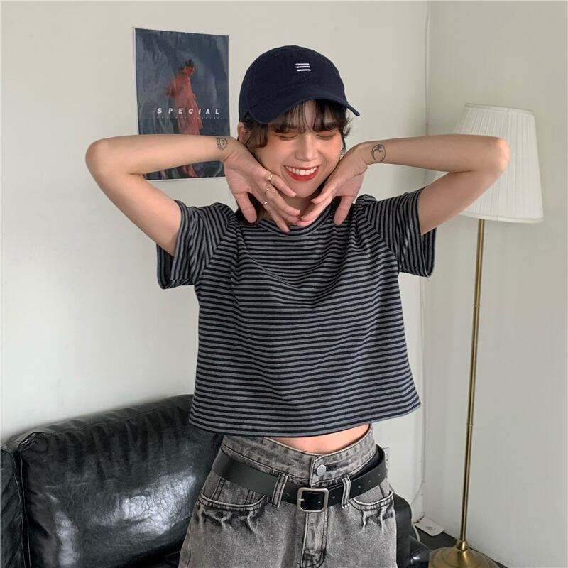 ラウンドネックストライプルーズハイウェストウェストショートTシャツスプリング夏服スタイルゆったりトップス 大人ガーリー スウィート キュート カジュアル 春物 夏物 Oネック ウエスト コーデ Marchs28158611483