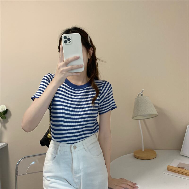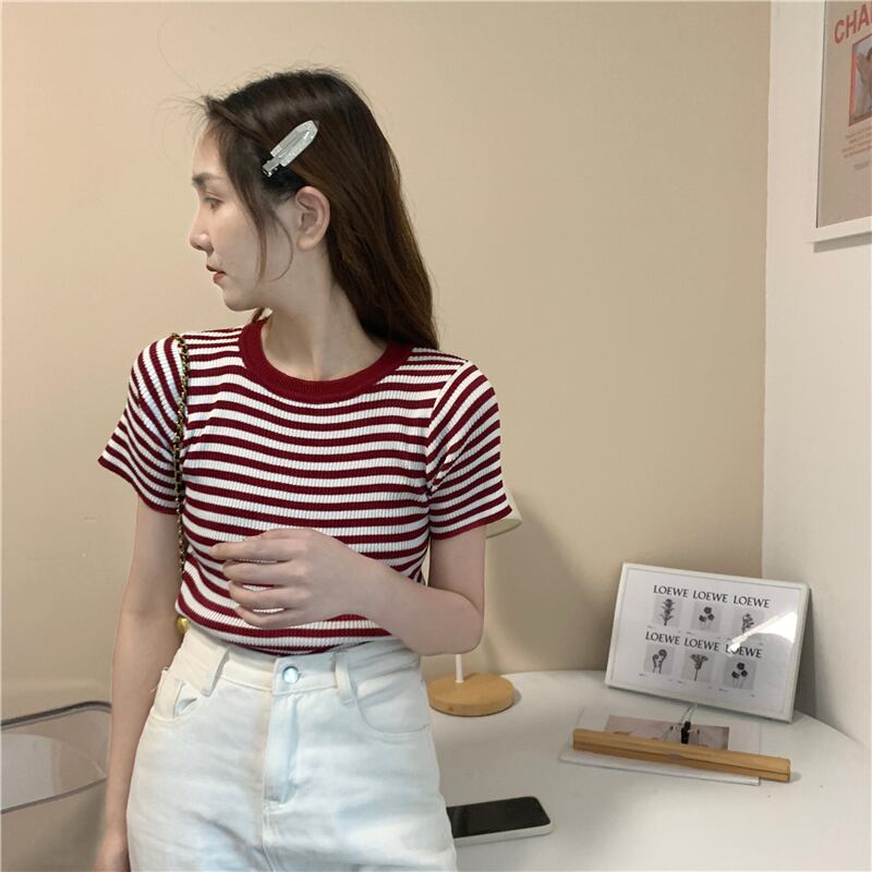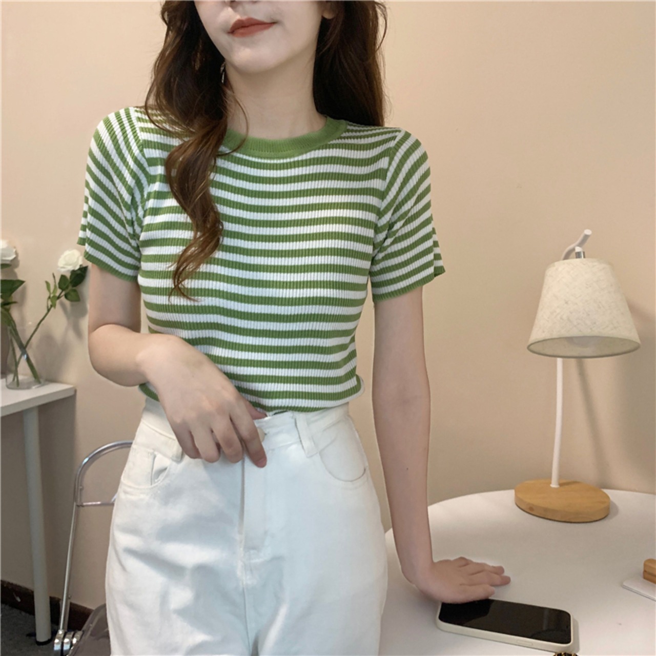 カラーストライプショートTシャツシャツ 夏服スリム薄手ゆったりニットトップス 夏物 コーデ Marchs61396715750