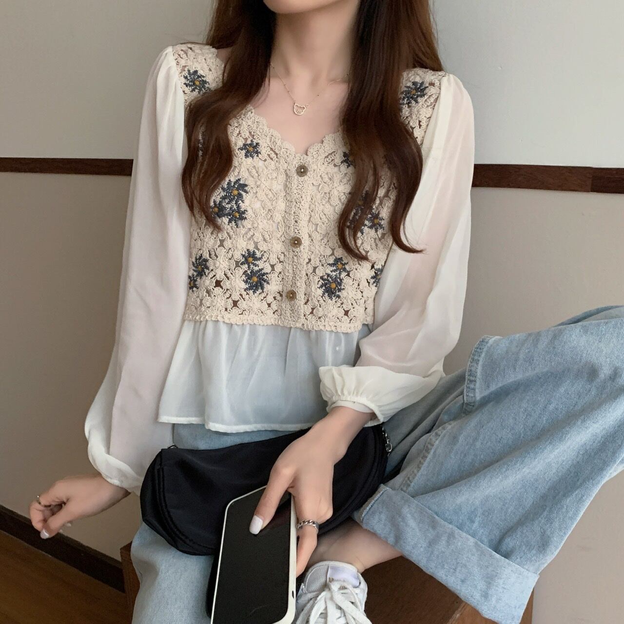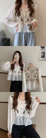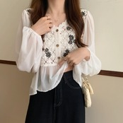ショートトップス Flowerデザイン レースVネックシフォンシャツ 夏服薄手 レッド 刺繍 夏物 フラワーデザイン コーデ Marchs49906984697