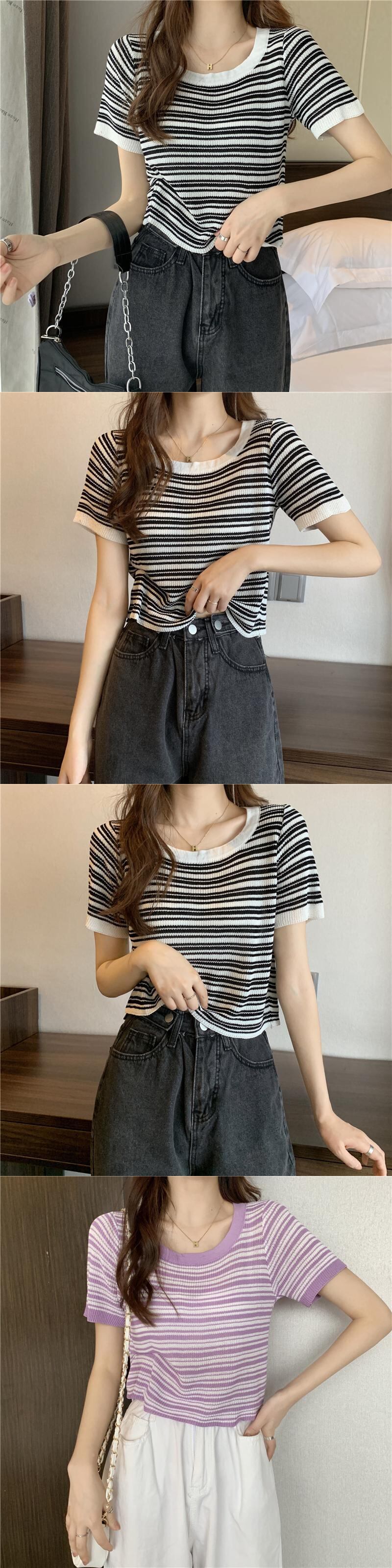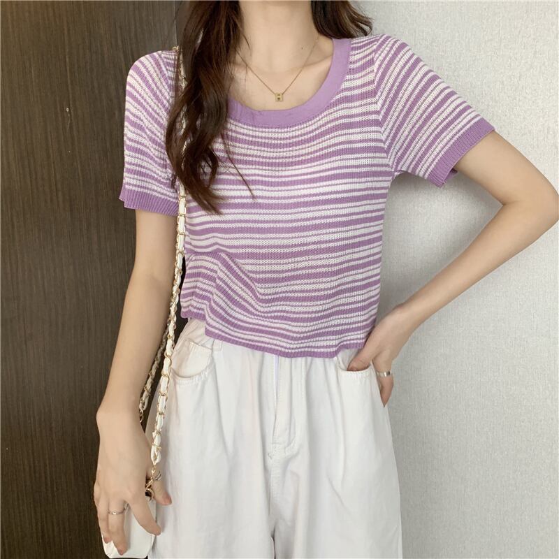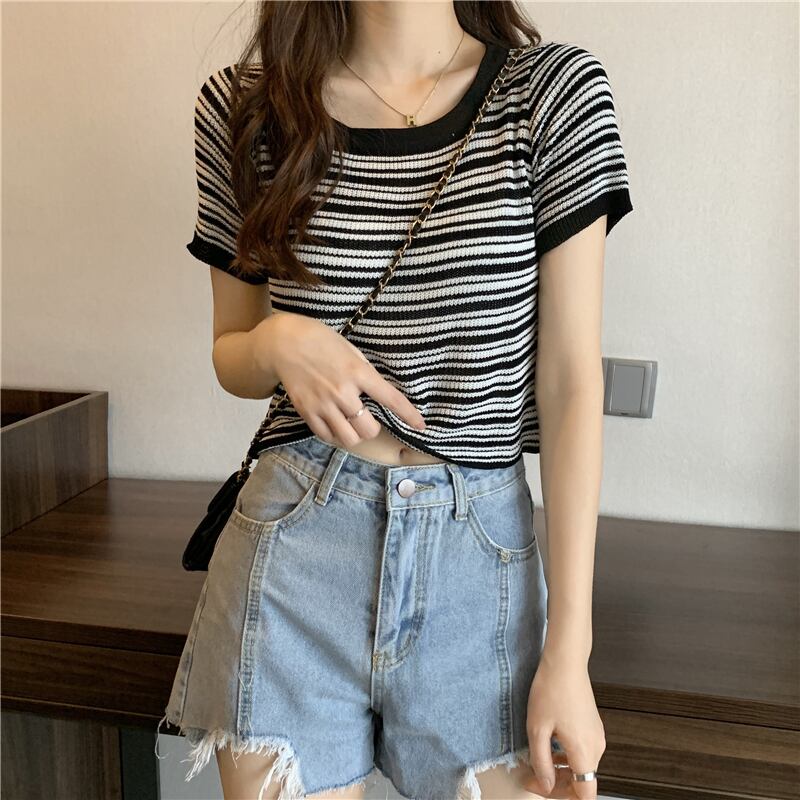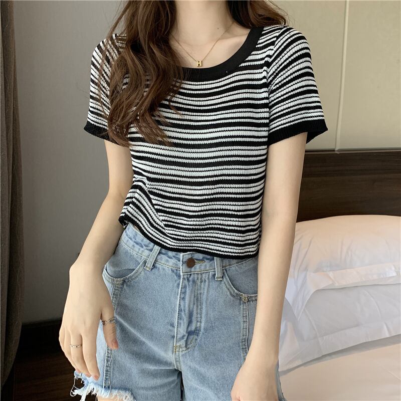 ストライプニットセーター ショートTシャツNEW夏服ワンピースハイウェストウェストクロップドトップス 夏物 シルク ウエスト コーデ Marchs38978448268