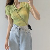 ニットシャツ ショートTシャツ夏服スリムフィット薄手クロップドトップス 夏物 コーデ Marchs48507896097