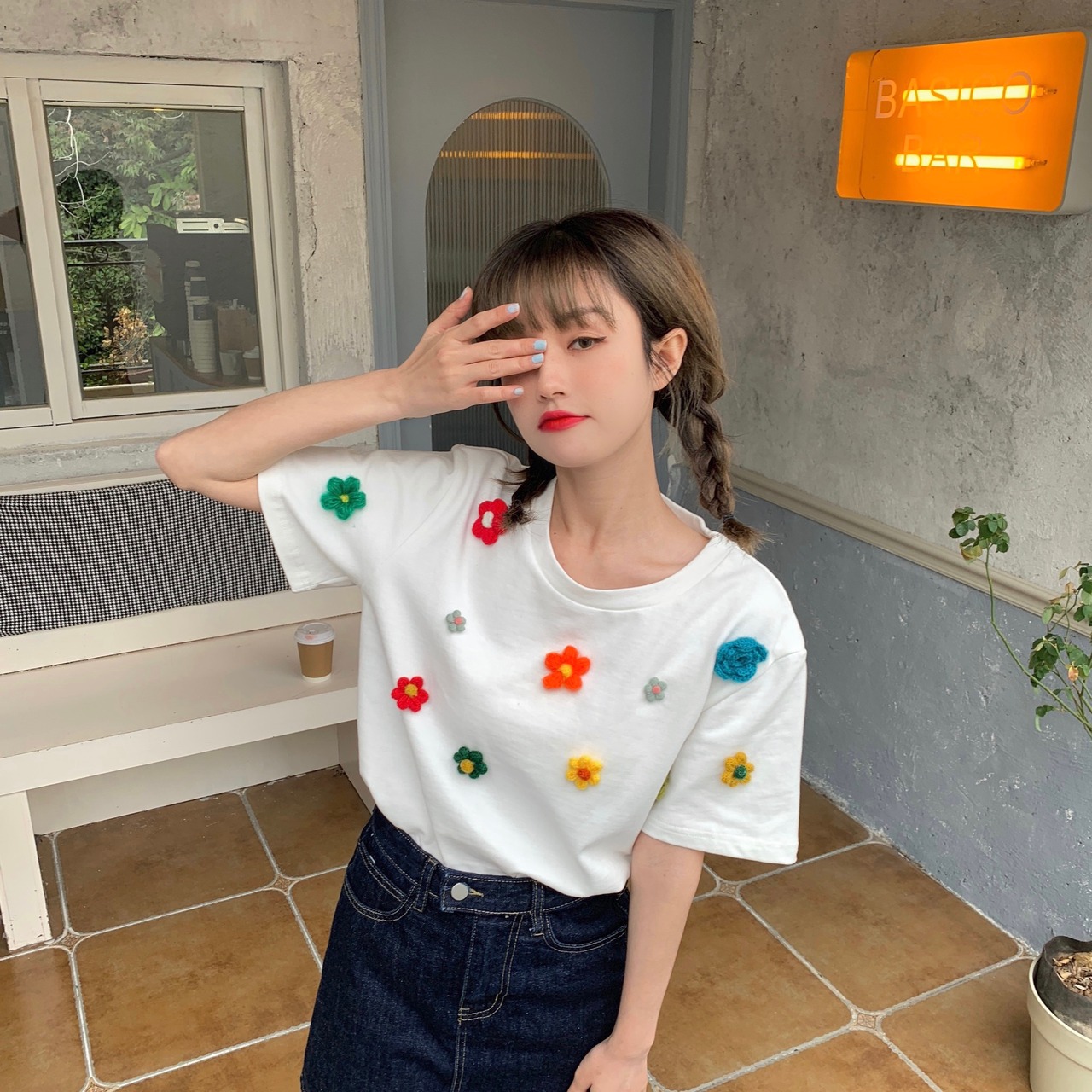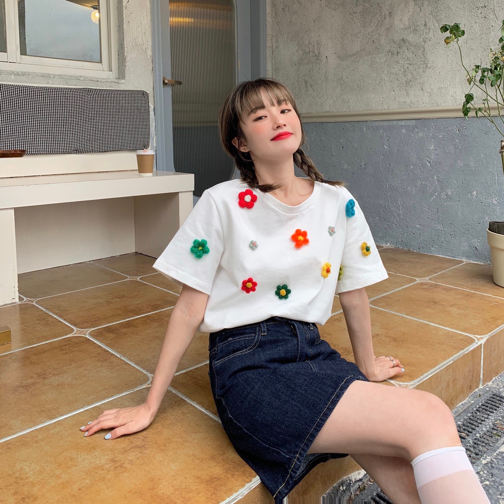 Flowerデザイン ホワイトTシャツ夏服NEWラウンドネックカジュアルトップス 夏物 Oネック フラワーデザイン コーデ Marchs43576877950