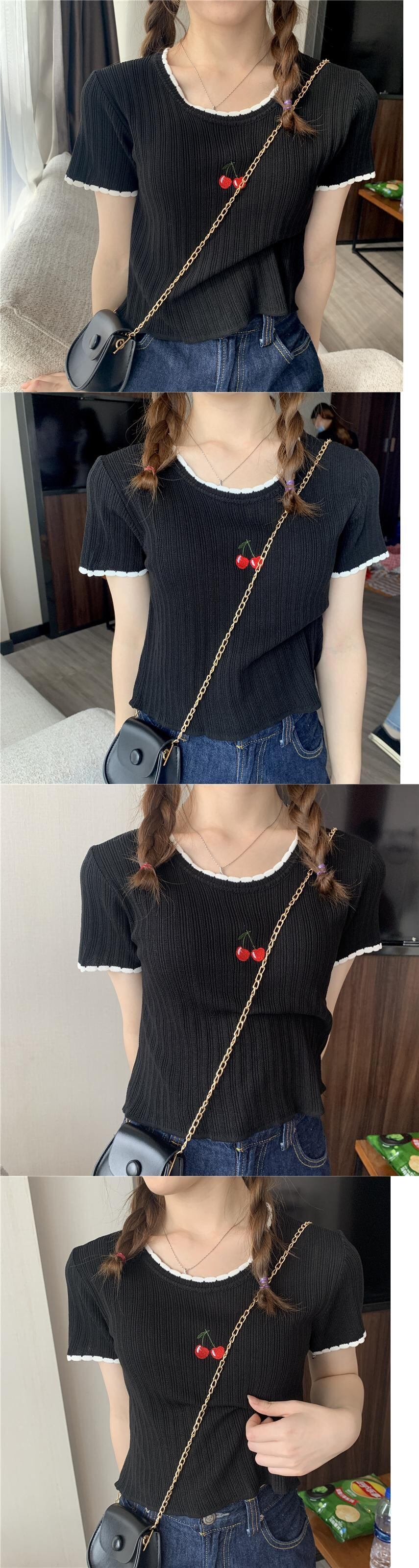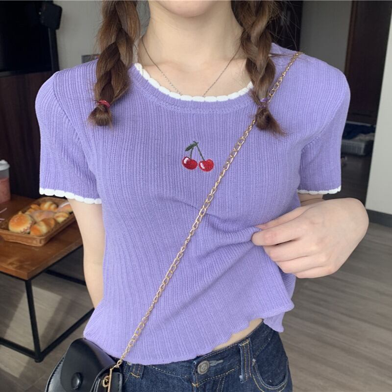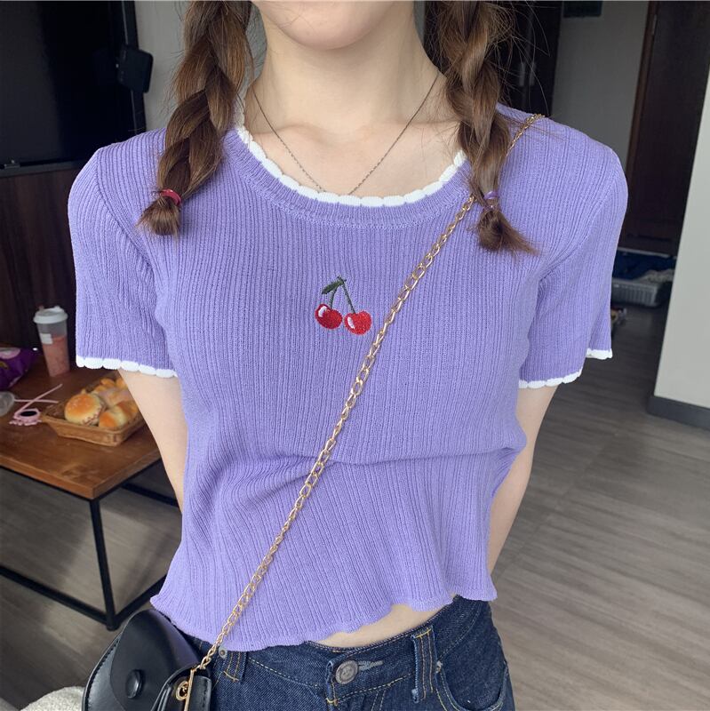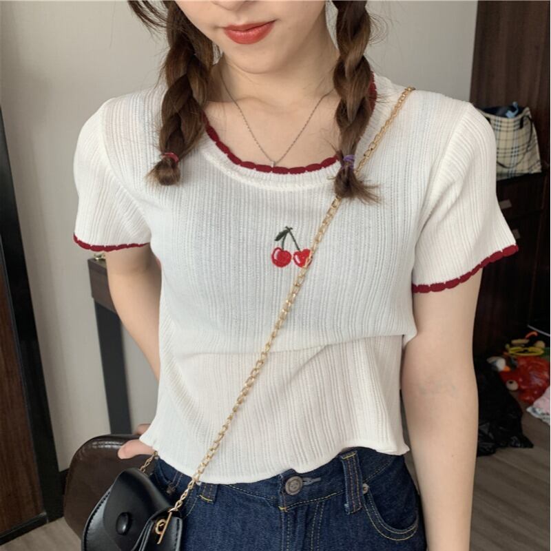刺繍ホワイトショートTシャツ夏服薄手スタイルハイウェストウェストラウンドネックセーター トップス 大人ガーリー スウィート キュート カジュアル 夏物 Oネック ウエスト コーデ Marchs50515141058