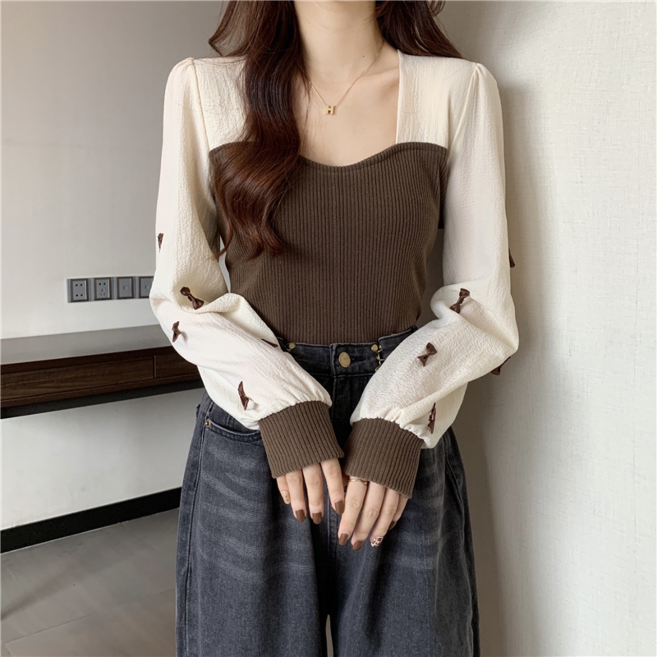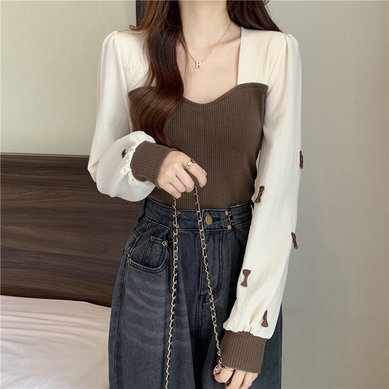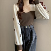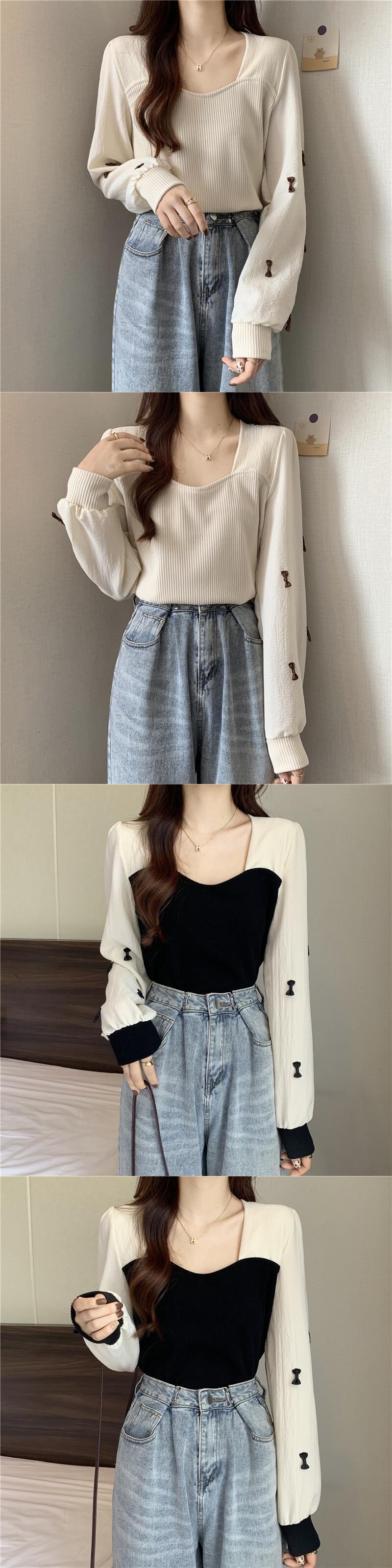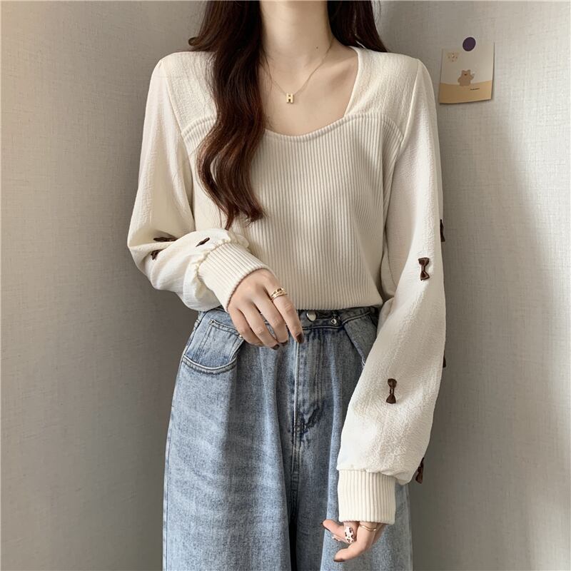 ニットゆったりシャツ スプリング秋物プルオーバー セーター リボントップス ロング 春物 オータム スクウェア ステッチ 長袖 コーデ Marchs68258300152