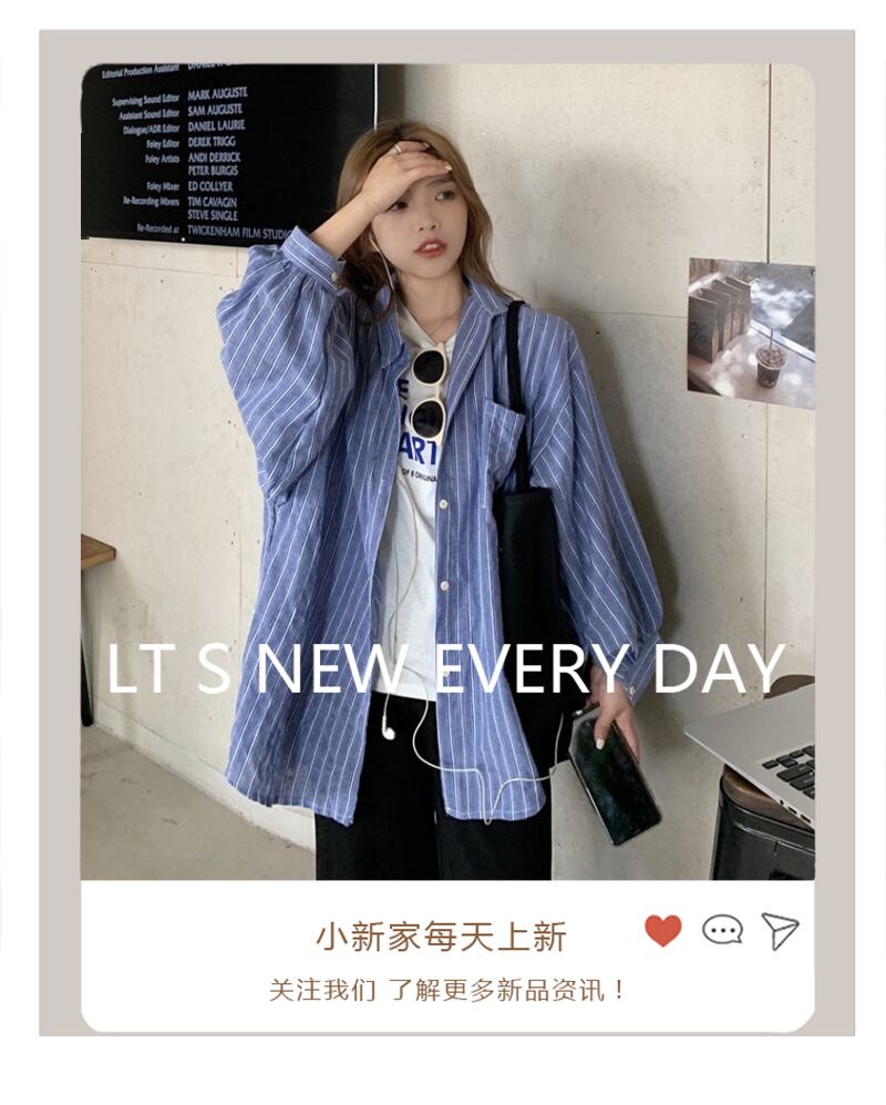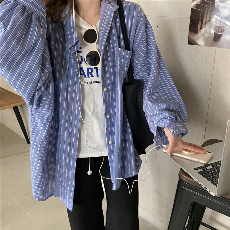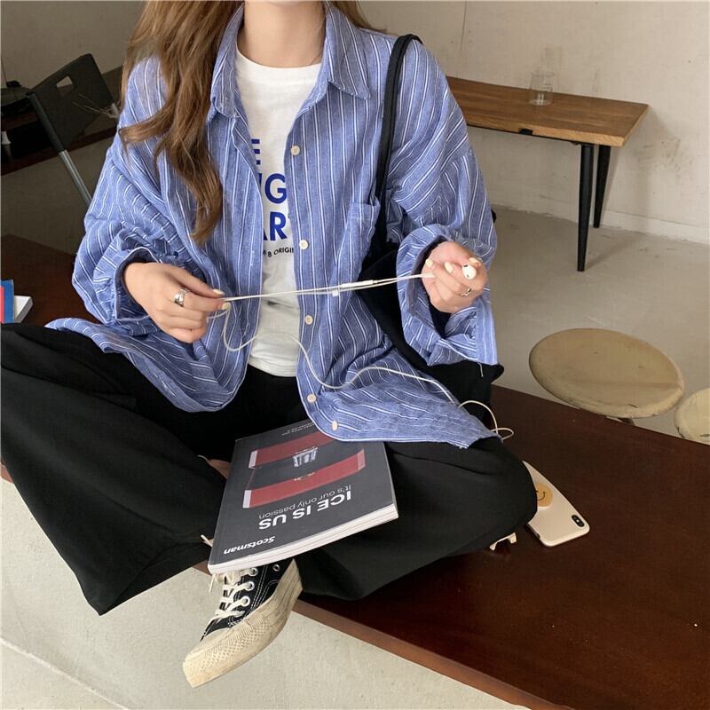 ブルーストライプシャツ スプリングジャケット ルーズトップス ロング 春物 長袖 コーデ Marchs11366470057