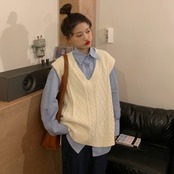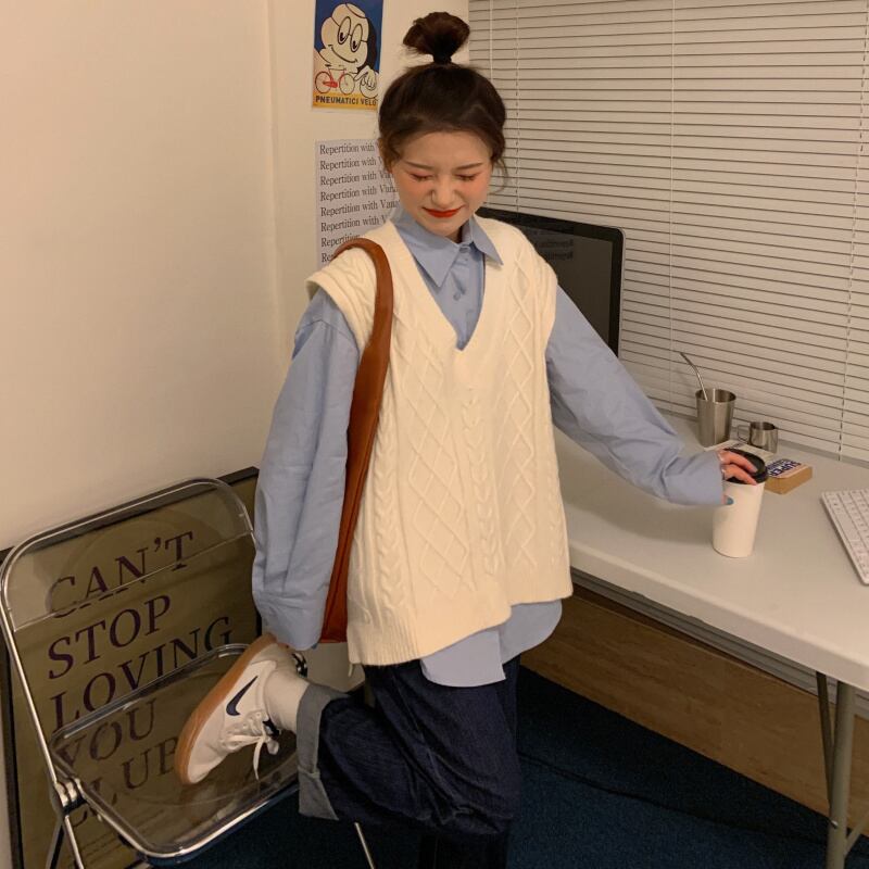 色:青いシャツ,ピンクのシャツ,ベージュのベスト,ピンクのベスト