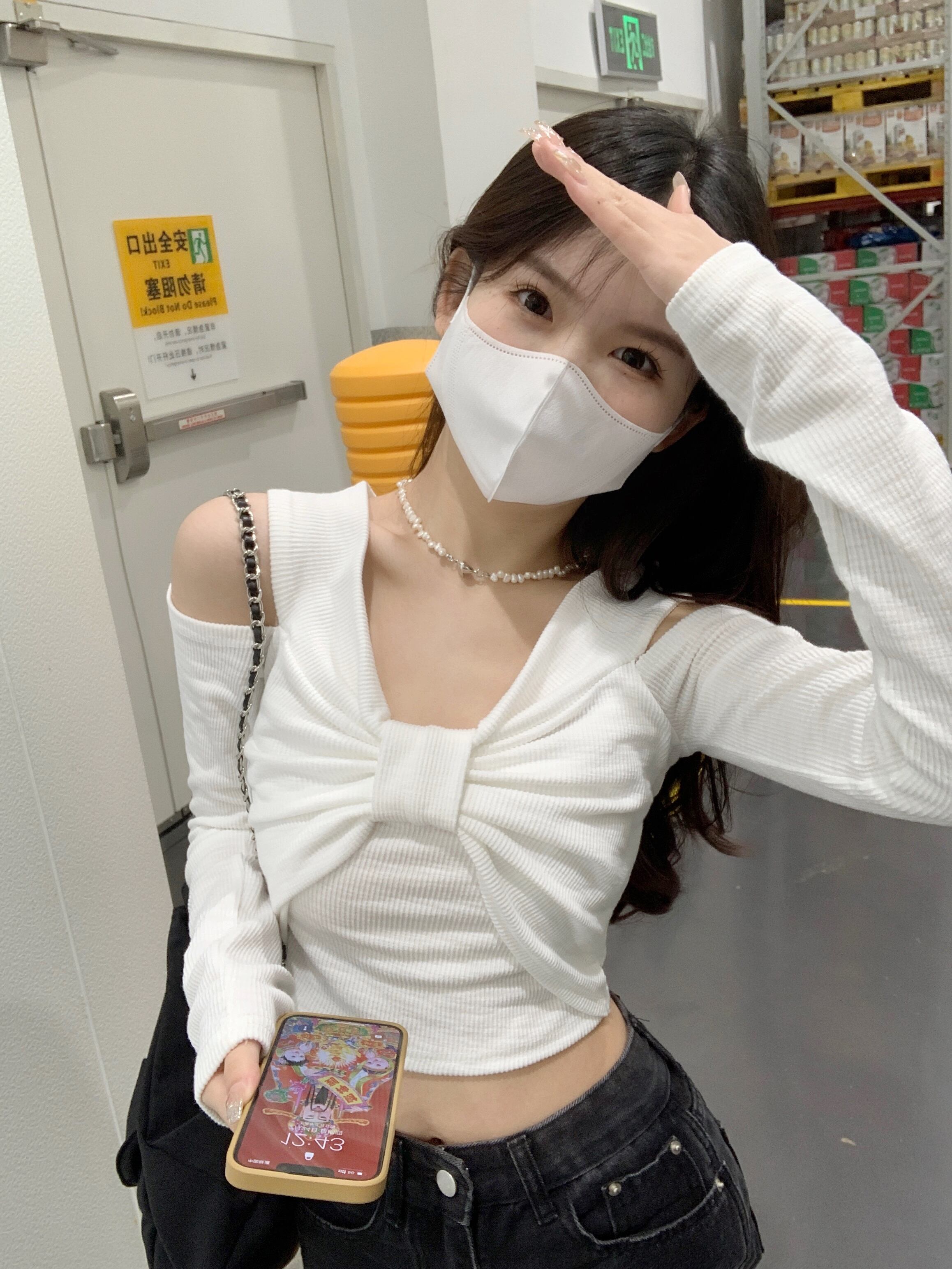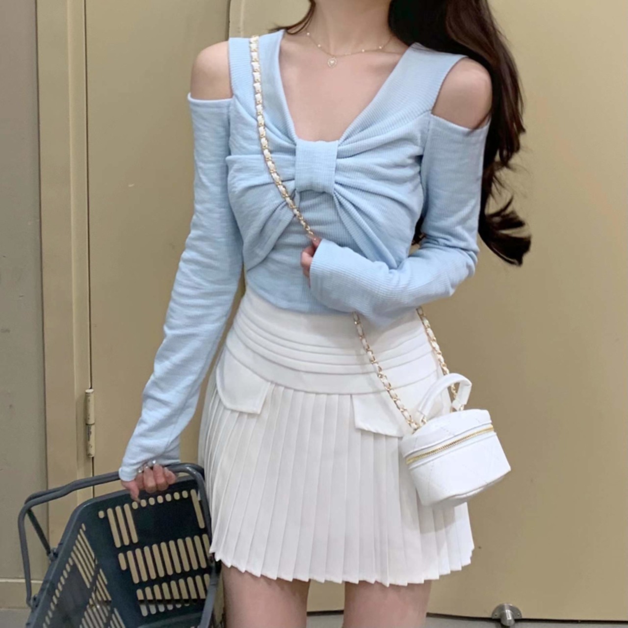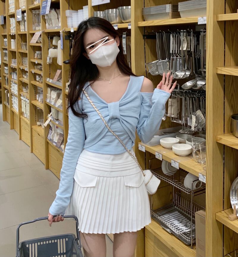 ブルーTシャツスプリングスリムフィットショートハイウェストトップス ロング 春物 長袖 ウエスト コーデ Marchs86012190619