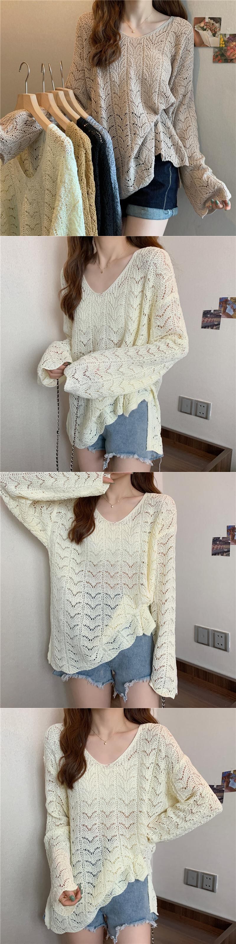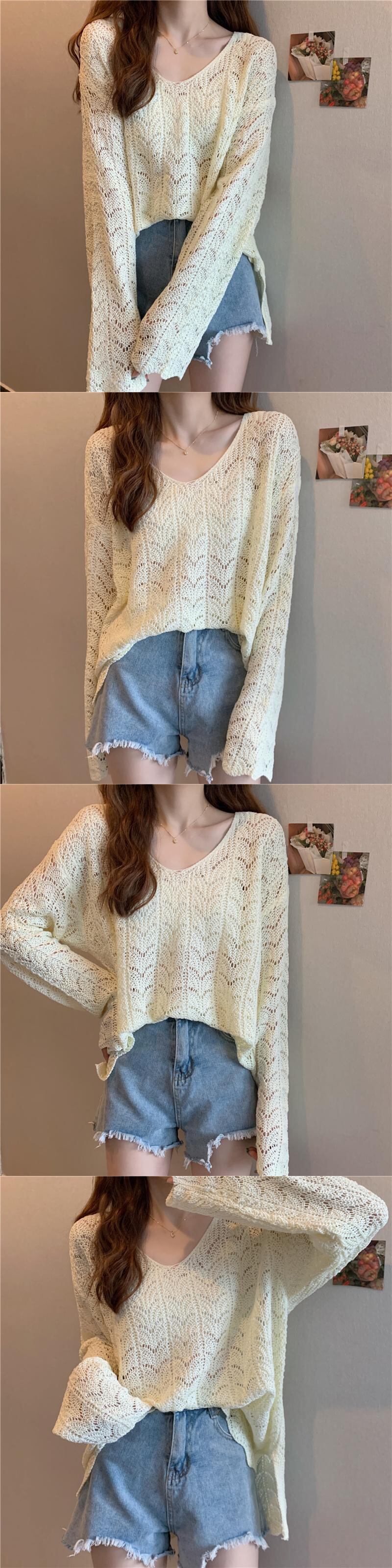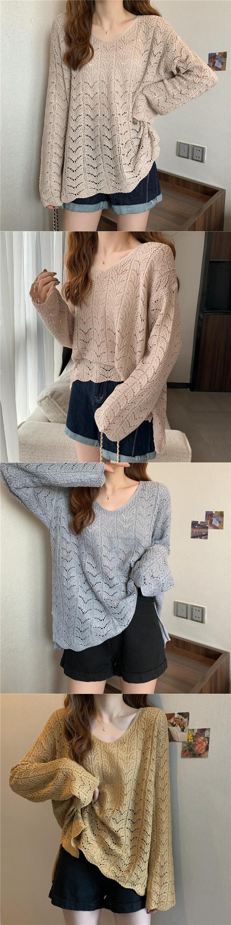 Tシャツ夏服薄手ニットブラウス 韓国ファッションルーズVネックトップス ロング 夏物 シルク スタイル 長袖 コーデ Marchs15010894972