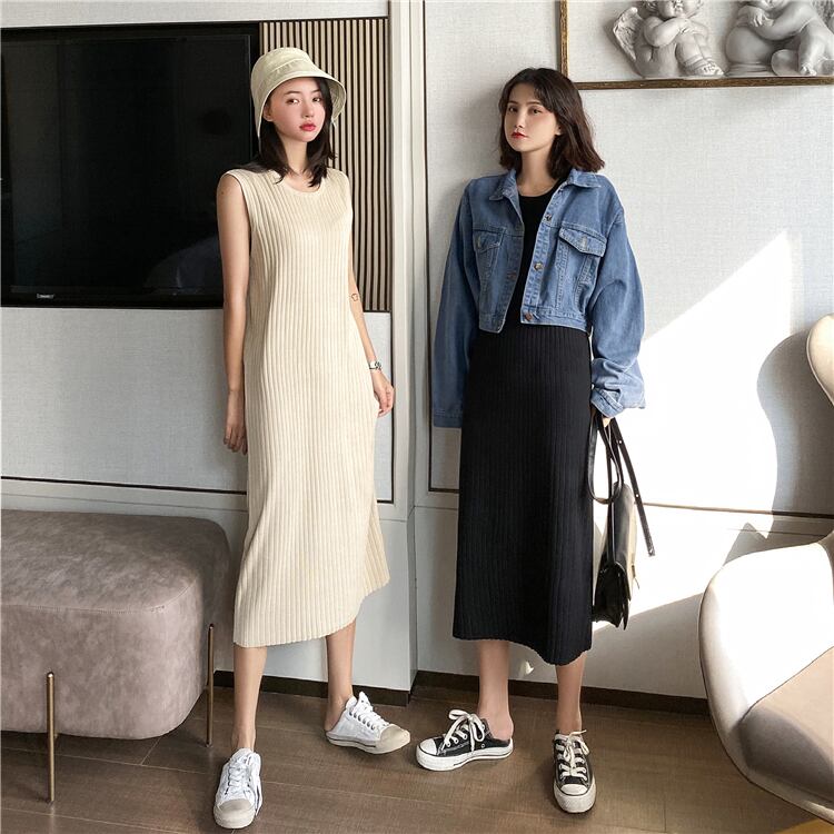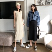 ニットスカート スプリング夏服ゆったりラウンドネックノースリーブルーズワンピース 春物 夏物 Oネック シルク ミドル丈 コーデ Marchs90887871366