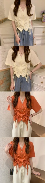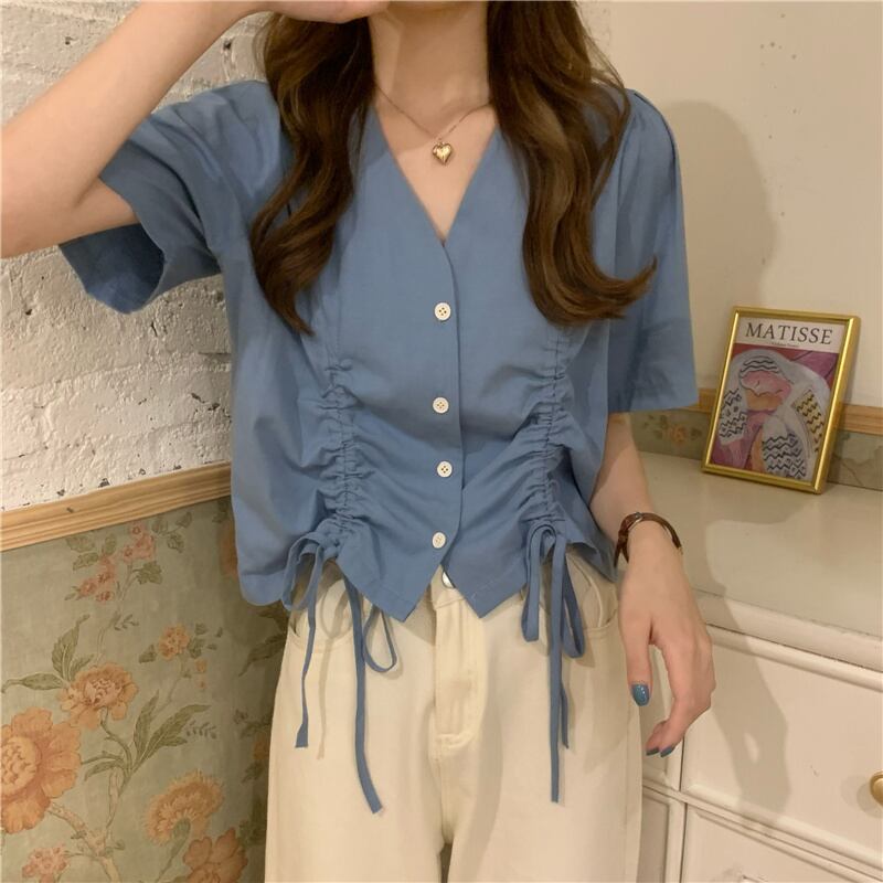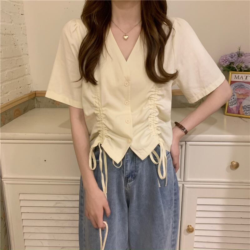 ショートシャツ夏服Vネックギャザートップス 夏物 パフスリーブ コーデ Marchs49923009660