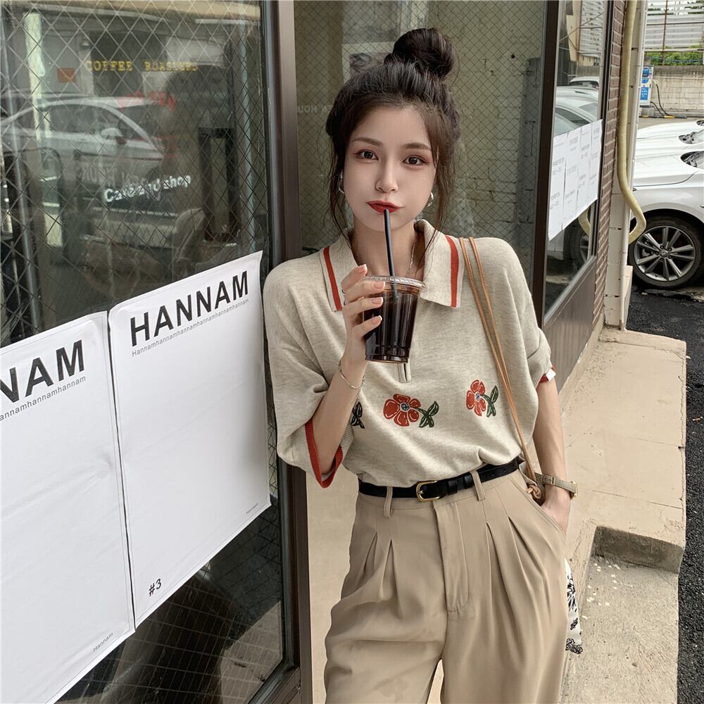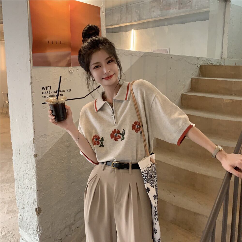 Flowerデザイン 刺繍カラーニットTシャツ夏服ルーズジッパートップス 夏物 シルク フラワーデザイン コーデ Marchs7679864213