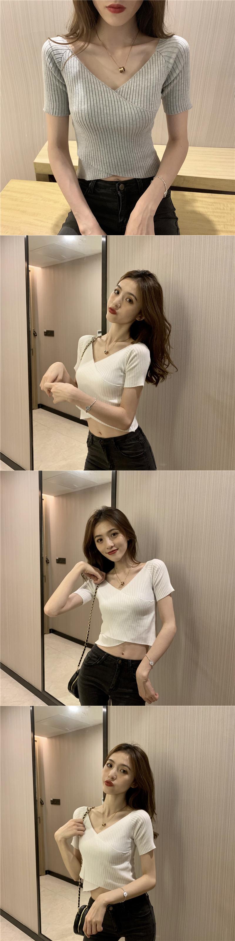 Tシャツシャツ 夏服ニットVネック薄手ゆったりショートハイウェストウェストパンツ トップス ピンク 半袖 ハーフスリーブ 夏物 ウエスト コーデ Marchs94057217113