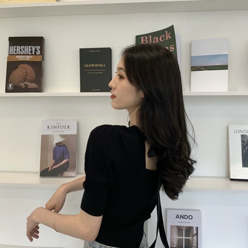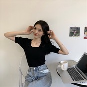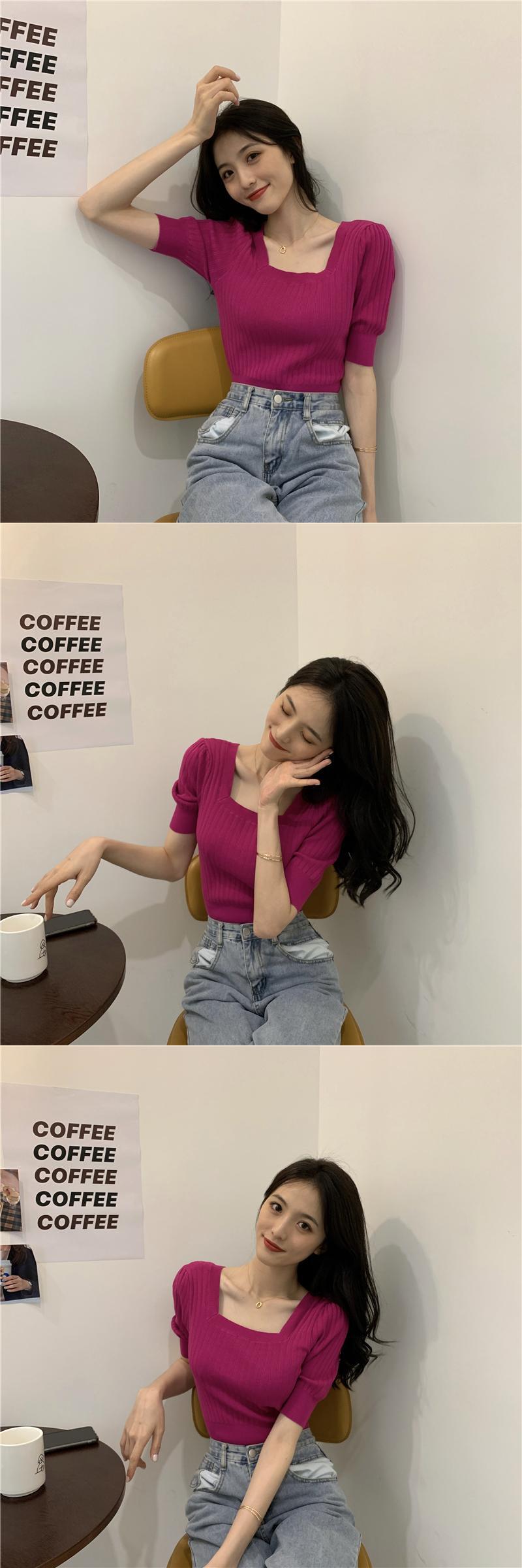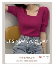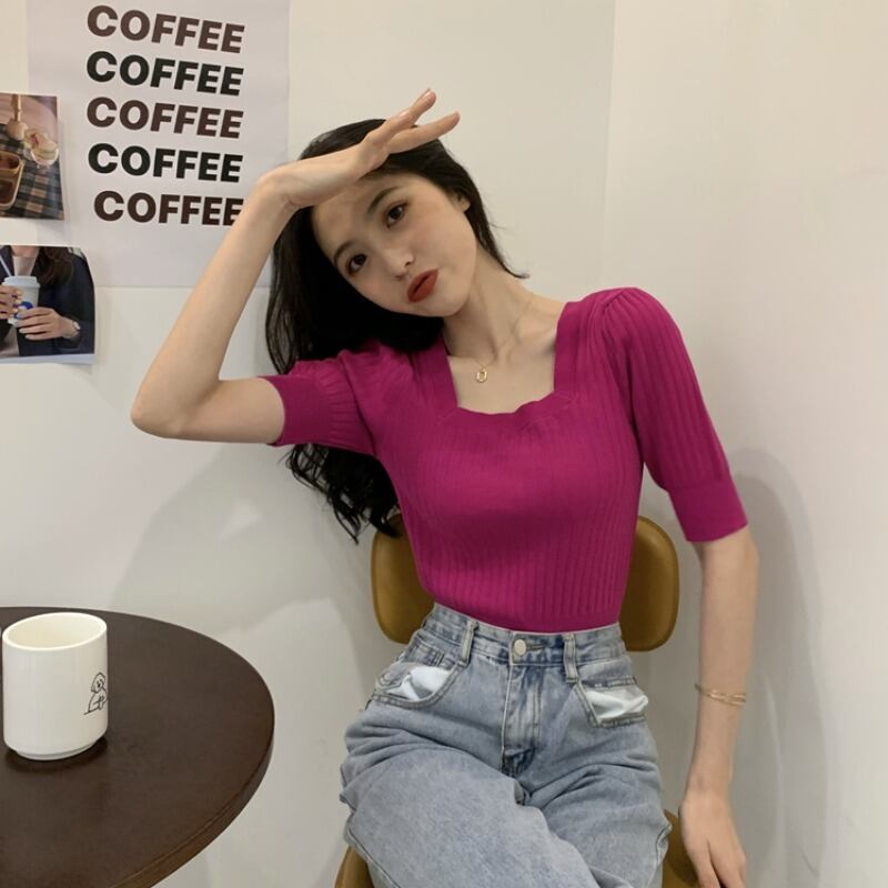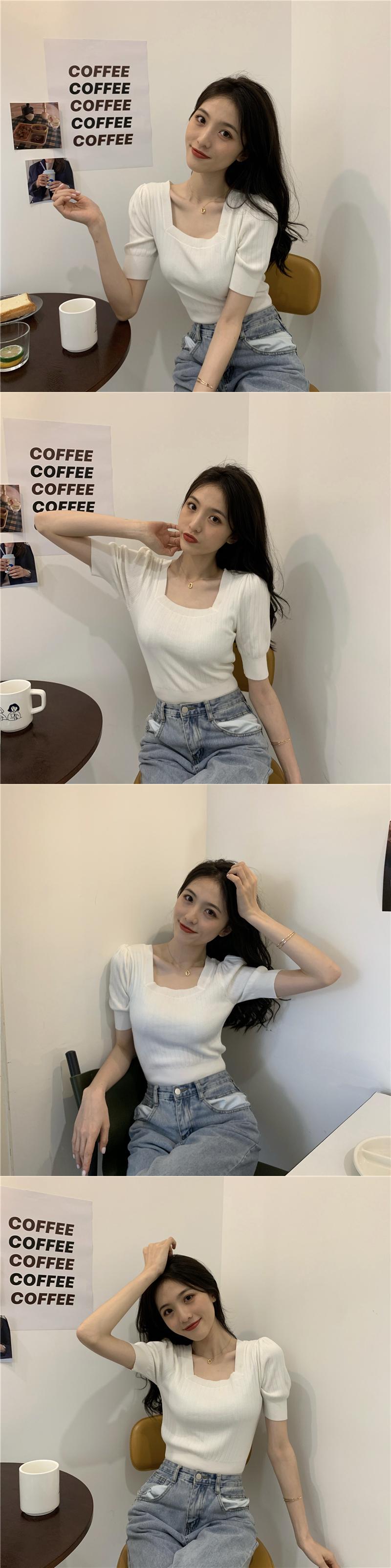 カラーハイウェストウェスト半袖スリーブTシャツトップス 夏服スリムニットセーター ショート ハーフスリーブ 夏物 スクウェア ウエスト コーデ Marchs7220903170