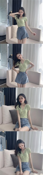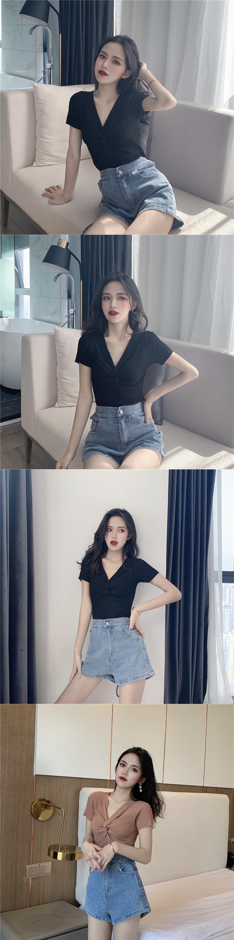 夏服スタンダードスリムソリッド カラーVネックTシャツセーター トップス レトロ 夏物 ソリッドカラー コーデ Marchs44253083747