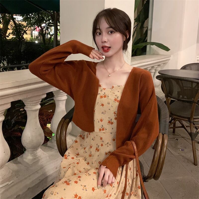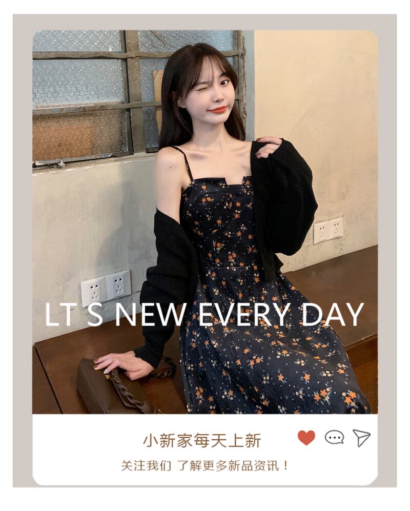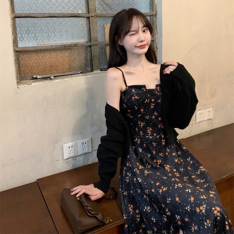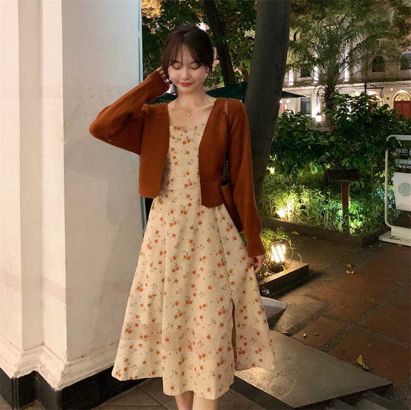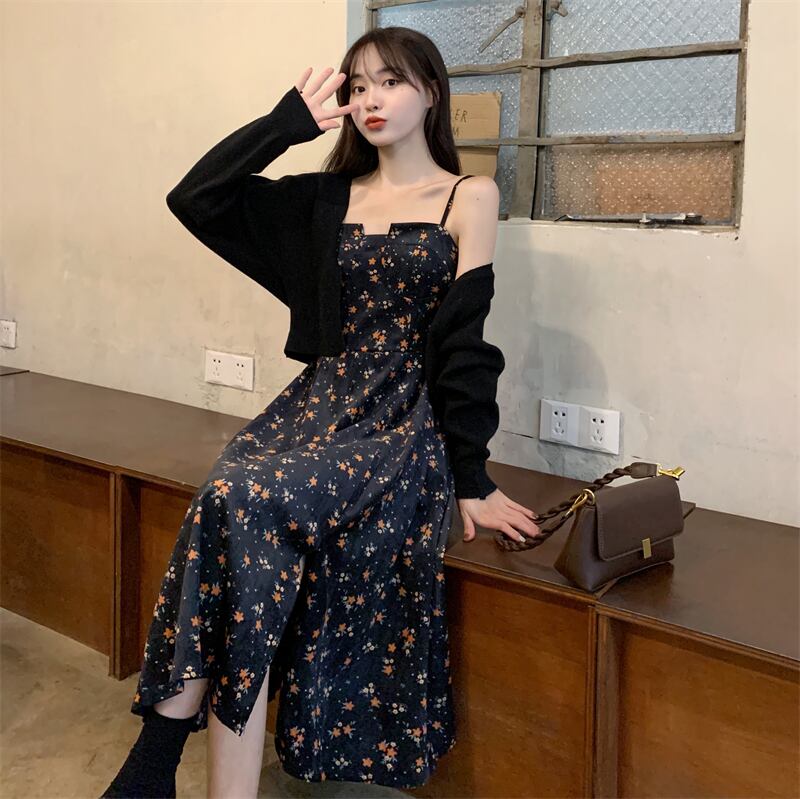 色:黒いセーターコート,オレンジ色のセーターコート,ブラックフローラルサスペンダースカート,アプリコットフローラルドレス