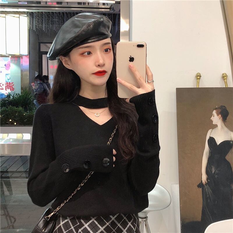 ブラックセーター ルーズ夏服Vネックニットゆったりシャツ トップス 夏物 コーデ Marchs82279154382