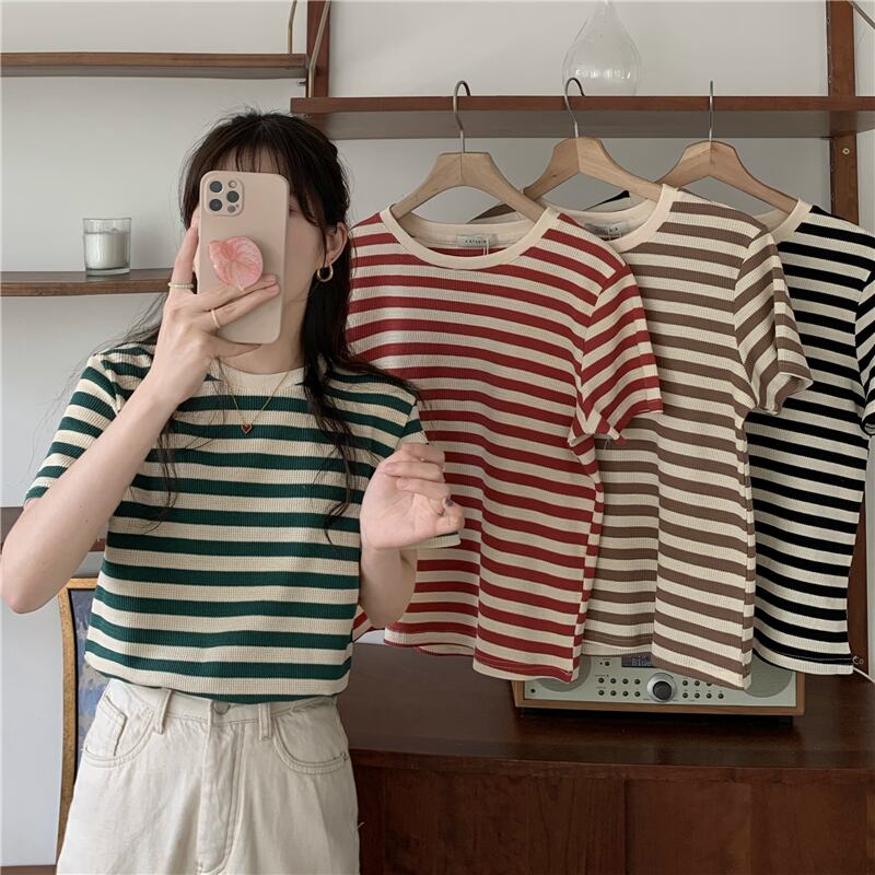 夏服スタンダードグリーンストライプTシャツルーズ薄手ゆったりトップス レトロ 夏物 コーデ Marchs10269767002