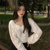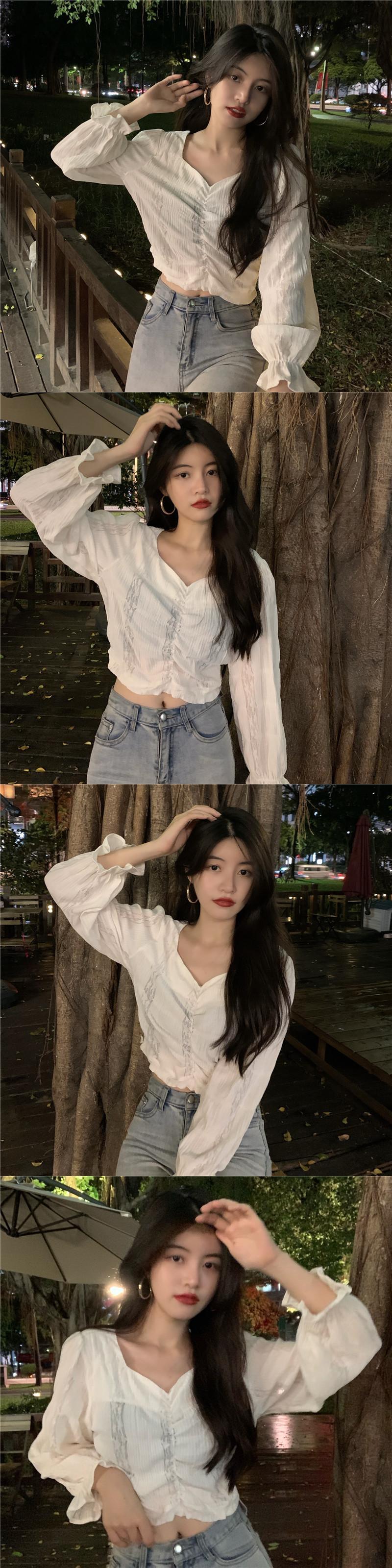 ホワイトVネックレースシャツ スプリングスタイルスリーブショートトップス 春物 コーデ Marchs48136857325